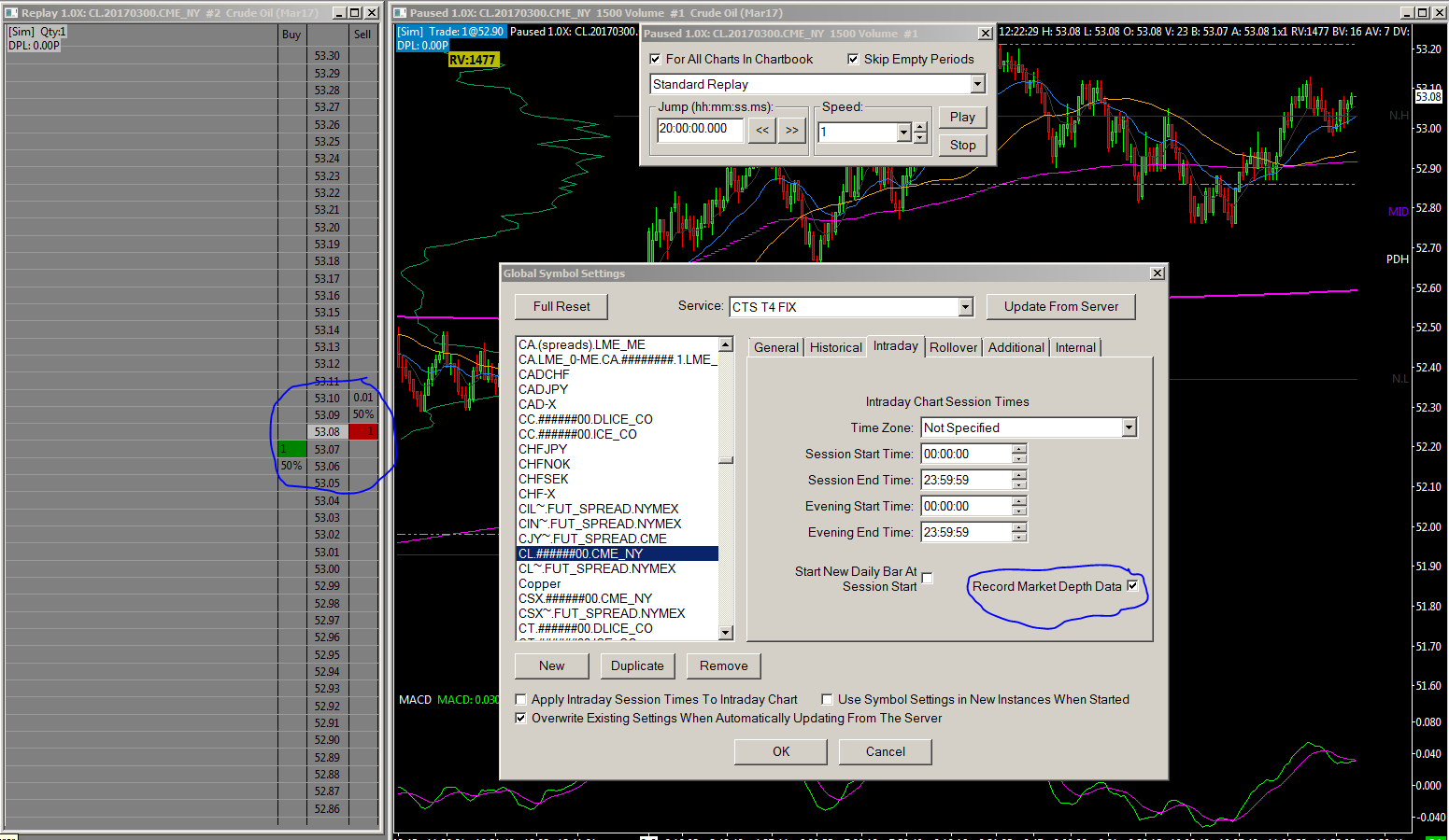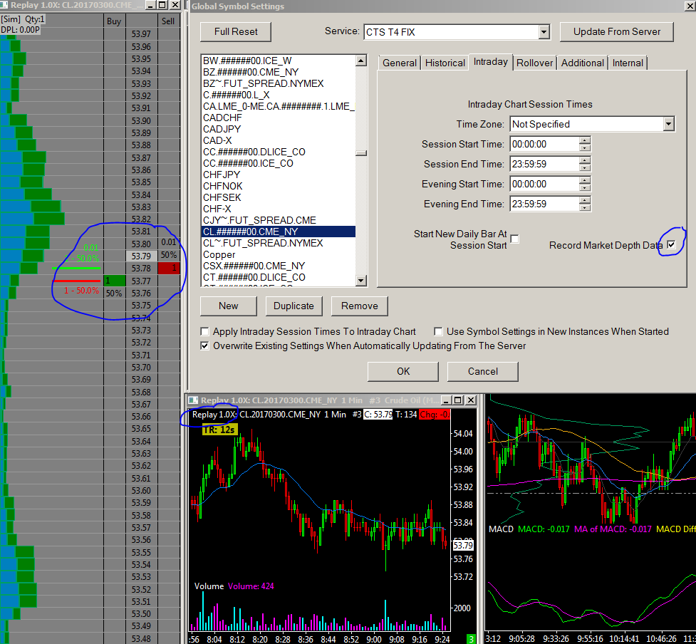 Ok thanks it works now. Just one more follow up question. Does it only record the DOM for the time period I am connected to the data feed? I tried to replay from early this morning and it didn't give me any DOM levels. I noticed that from the time I was connected to the data feed I could see the DOM levels in replay. Is that how it works? Thanks