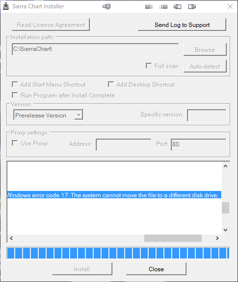 This is the problem: Error moving temporary file C:\SierraChart\DownloadedInstallationFiles\Data\UserContributedStudies.dll to final output file D:\backups\SierraChart\Data\UserContributedStudies.dll. Windows error code 17: The system cannot move the file to a different disk drive.