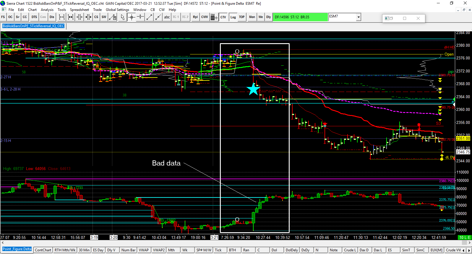 This is a data feed problem from Gain Capital. Most likely there is a problem with the bid and ask data. Either it is delayed or has stopped updating or is wrong in some other way. We will correct the data for the last week. However, we cannot solve the problem and it can reoccur. For a good data feed use the Sierra Chart Exchange Data Feed: Sierra Chart Exchange Data Feed Sierra Chart Support - Engineering Level Your definitive source for support. Other responses are from users. Try to keep your questions brief and to the point. Be aware of support policy: https://www.sierrachart.com/index.php?l=PostingInformation.php#GeneralInformation For the most reliable, advanced, and zero cost futures order routing, *change* to the Teton service: Sierra Chart Teton Futures Order Routing Date Time Of Last Edit: 2017-03-21 17:30:23