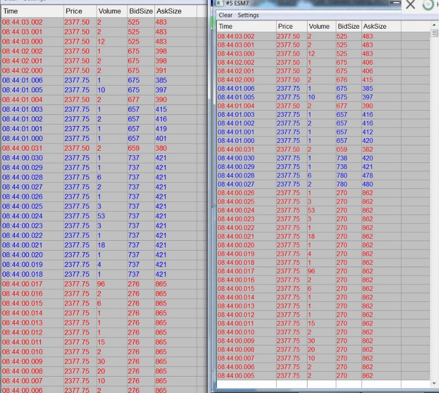 I have the same problem (with both real-time and historical data)and done a comparison between TransAct and Gain data feed. Please look at the attached file. it seems that with Gain some Bids are reported as Ask. The one on the left is from Gain and right one is from TransAct. You can clearly see it between: 8:44:00.018 and 8:44:00.026 Is this a Gain problem or some settings in SC? Date Time Of Last Edit: 2017-03-21 19:12:28