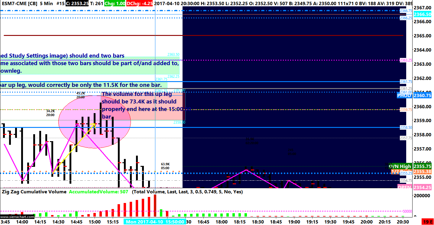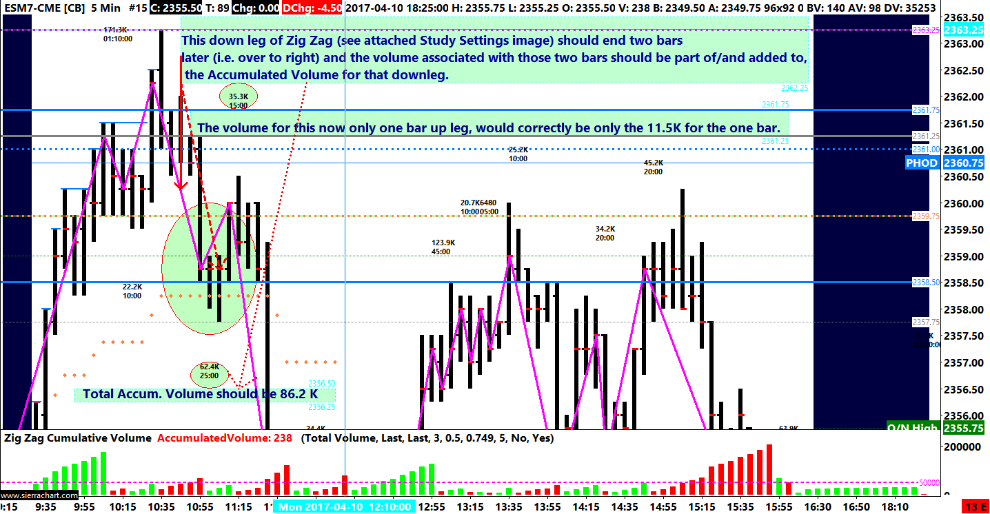 I just found another similar error on the same chart at the up leg beginning at the 14:25:00 bar. The last leg should end with the 15:00:00 bar (close/last = 2358.75), NOT at the 14:45:00 bar (last/close also 2358.75). Once again, as my yellow arrow indicates, the up leg should shift/move over to the similar last/close of the 15:00:00 bar before turning down. Also, once again, as noted on the image, that would change/increase the Total Accumulated Volume on both that up leg, as well as decrease the Tot. Acc. Vol. on the subsequent down wave. http://www.sierrachart.com/image.php?Image=1491884476808.png Date Time Of Last Edit: 2017-04-11 04:36:01