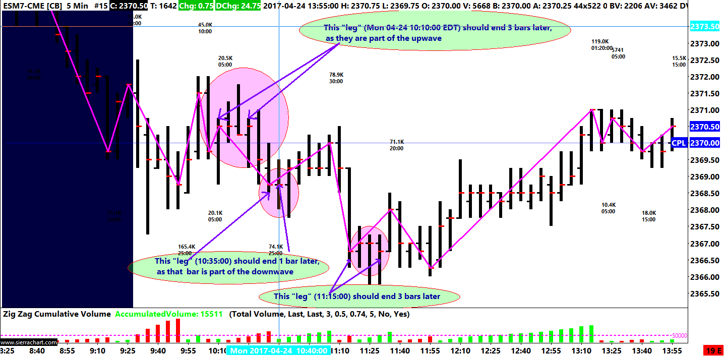 On a basic 5 minute chart of the ESM7, Continuous Date Rule Rollover, Back Adjusted, I have a basic Zig-Zag Study (see attached image) calculation mode 3, input for High/Low =Last/Reversal amount =.749. My contention is that the legs and therefore the Total Accumulated Volume per leg are not being charted and calculated correctly. Case in point pointed out on copy of chart concerns bars at 10:55/11:00/11:05 EDT today, Monday April 10, 2017. The down leg, which begins correctly at 10:35 a.m., ends, as charted (incorrectly in my opinion) on the 10:55 a.m. bar (last = 2358.75), and, because the next two bars also close at 2358.75, the leg should shift over those two bars to the last/close of the 11:05 bar (Total Volume for the seven bars composing that down leg should print 86.2K ). The next bar (11:10 a.m.) is an up bar (last = 2360.00), and that one bar (volume 11458) comprises the next up leg, as price falls from there starting a new down leg. http://www.sierrachart.com/image.php?Image=1491880816769.png |