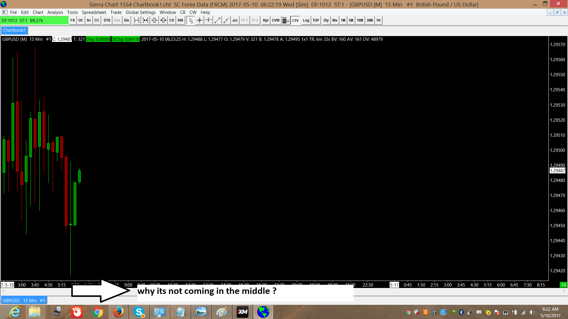 We want you to re-download the data in the chart by going to the chart and selecting Edit >> Delete All Data and Download from the main menu. Also you have 650 pixels of spacing between the chart bars. You can reduce that by pressing and holding the down arrow key on your keyboard. Sierra Chart Support - Engineering Level Your definitive source for support. Other responses are from users. Try to keep your questions brief and to the point. Be aware of support policy: https://www.sierrachart.com/index.php?l=PostingInformation.php#GeneralInformation For the most reliable, advanced, and zero cost futures order routing, *change* to the Teton service: Sierra Chart Teton Futures Order Routing |