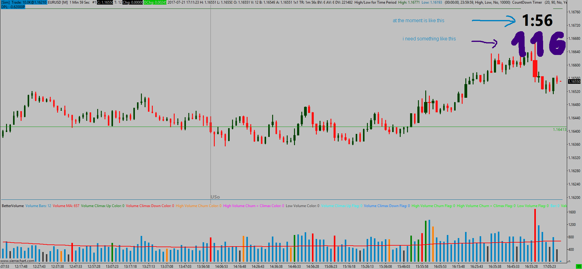 This will be supported in the next release with a new study Input with the Countdown Timer study. Sierra Chart Support - Engineering Level Your definitive source for support. Other responses are from users. Try to keep your questions brief and to the point. Be aware of support policy: https://www.sierrachart.com/index.php?l=PostingInformation.php#GeneralInformation For the most reliable, advanced, and zero cost futures order routing, *change* to the Teton service: Sierra Chart Teton Futures Order Routing Date Time Of Last Edit: 2017-07-21 17:15:52