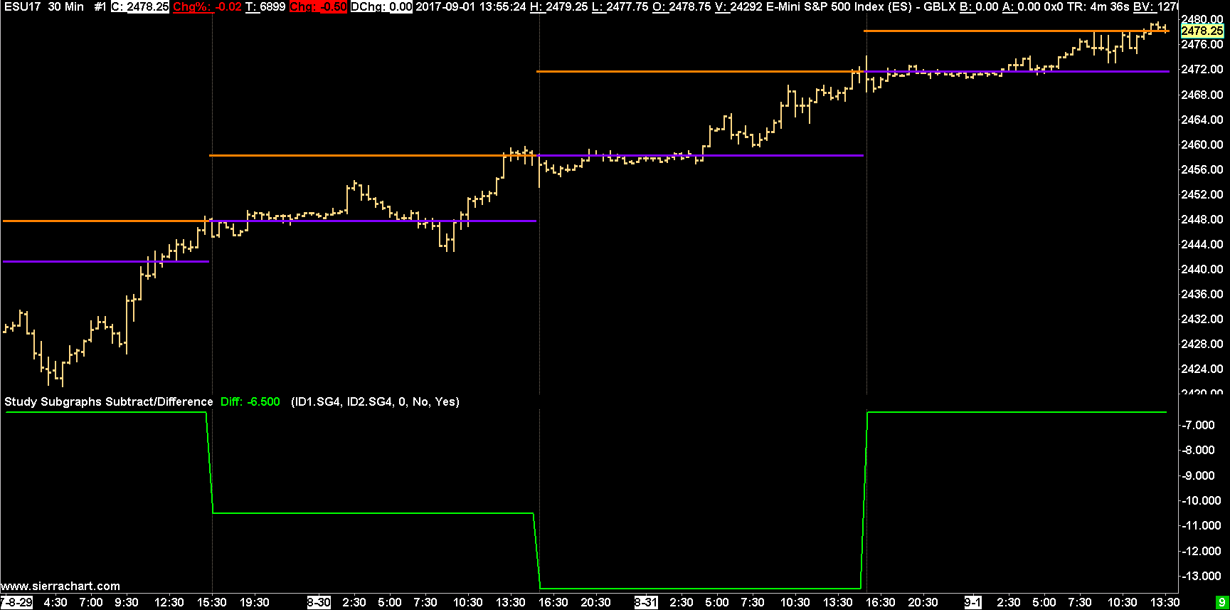 We have prepared a Study Collection to accomplish what you want: http://www.sierrachart.com/image.php?Image=1504290339783.png It is attached. Here are the instructions to use it: http://www.sierrachart.com/index.php?page=doc/StudyCollections.html#UsingStudyCollectionProvidedBySierraChartSupport Also you have the ability to edit a post by clicking the "Edit" link at the lower right of the post. Sierra Chart Support - Engineering Level Your definitive source for support. Other responses are from users. Try to keep your questions brief and to the point. Be aware of support policy: https://www.sierrachart.com/index.php?l=PostingInformation.php#GeneralInformation For the most reliable, advanced, and zero cost futures order routing, *change* to the Teton service: Sierra Chart Teton Futures Order Routing Date Time Of Last Edit: 2023-03-20 21:01:28