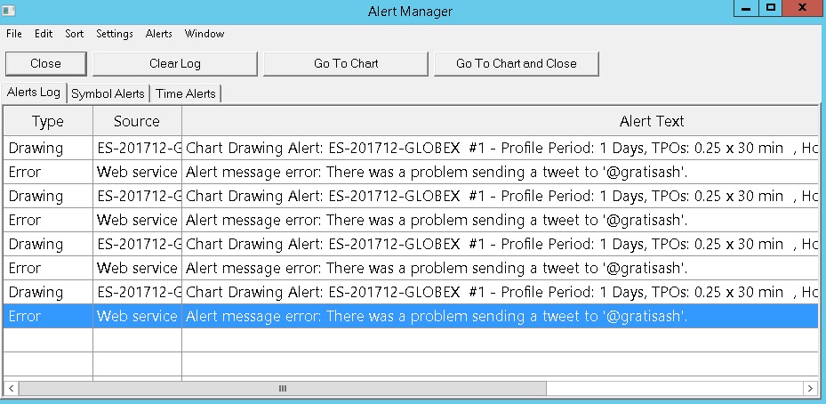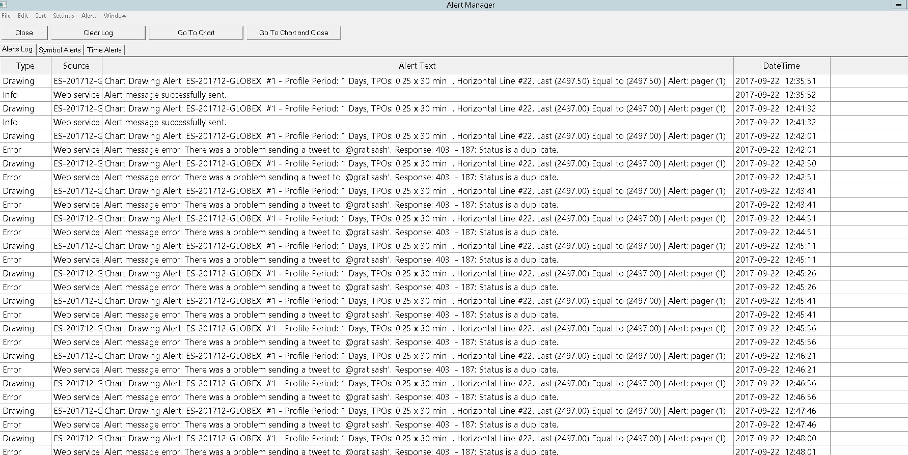 We have verified that the Bar Date-Time is correct for the chart drawing alert messages. It is the starting time of the chart bar. We cannot help with Twitter rejecting the messages. We cannot spend further time on this. Sierra Chart Support - Engineering Level Your definitive source for support. Other responses are from users. Try to keep your questions brief and to the point. Be aware of support policy: https://www.sierrachart.com/index.php?l=PostingInformation.php#GeneralInformation For the most reliable, advanced, and zero cost futures order routing, *change* to the Teton service: Sierra Chart Teton Futures Order Routing |