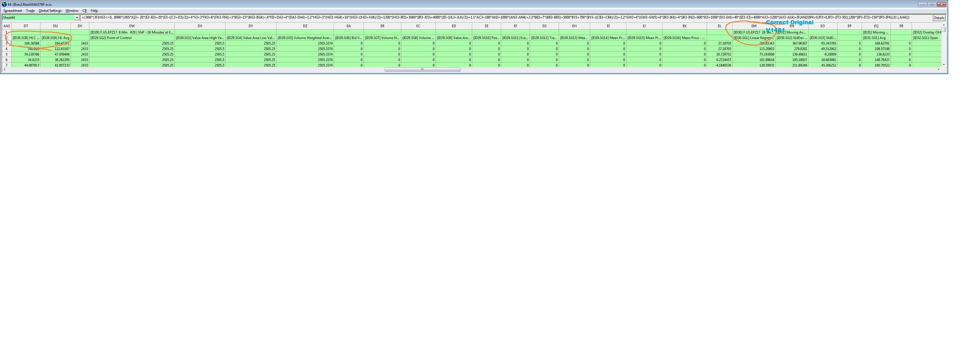 I waited a long time to update to newest 1615, from 1482, watching lots of development-- till dev finished major progress. V1615 has a great improvement in memory usage with my large 53-chart, 12 spreadsheet Chartbook. Problem: Spreadsheets shifted columns on VbP Vol by price, number of output columns,dropping from 16 on one, to 4-- but not all (some in my V1482 had and still have (in V1615) 4-column output) 1482 VbP on one chart was putting out 16 columns (not sure why) when others put out 4 columns. 1615 VbP on same chart VbP puts out 4 columns (default?) (no longer 16). I didn't change anything between update version. Note: I tested 1615 on an existing Source Chart VbP by adding a test Spreadsheet. That defaults to 3 columns where it is not This is on overlay of VbP from Chart with no spreadsheet into chart with spreadsheet (overlay Uses Colors,Styles from Source). I don't see option to change columns input to overlay or in source VbP study. This may affect 2 or 3 spreadsheets. Since these charts work together, several charts are now wrong. Other than that, V1615 looks great. Using V1615 I added a test Spreadsheet to the same Source VbP above that had (under 1482) output 16 cols to target spreadsheet but now puts out 4 cols. (SG2 to Vol Wgted Avg SG5) under 1615. In this test source chart-Sprdsheet V1615 puts 3 cols, to SG4 (Val Area Low). Date Time Of Last Edit: 2017-09-25 17:13:13