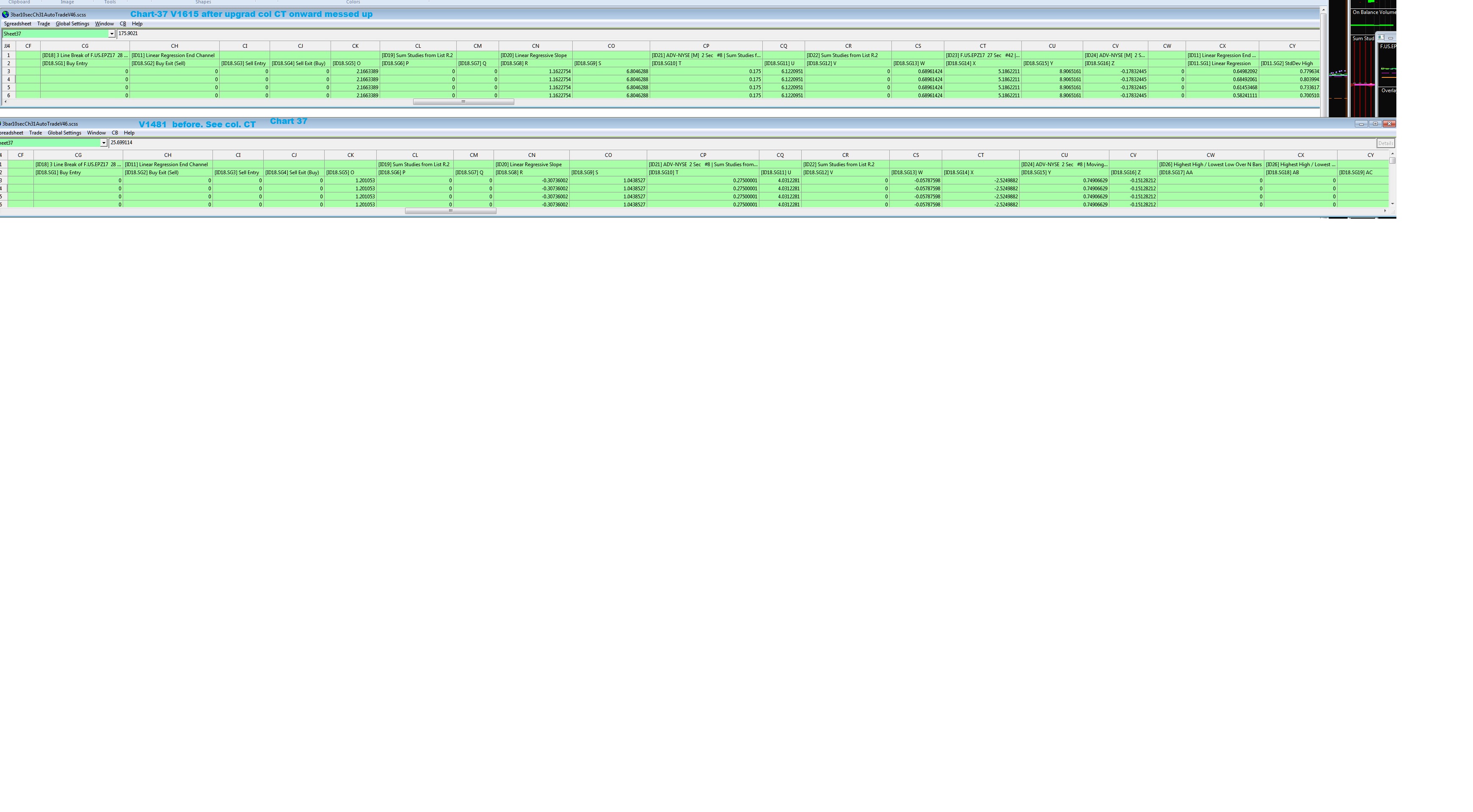 The Horizontal Lines Study for Filler caused the Mess seen in the last-above pic. - - - - I started over: before & after upgrade nothing else, but a wider view of #44 Spreadsheet. See wider view pics here. All studies are there, just shifted by the 11 missing columns, as explained to you. Just stop the sheet builder from replacing the old Spreadsheet if column counts don't match prior. |