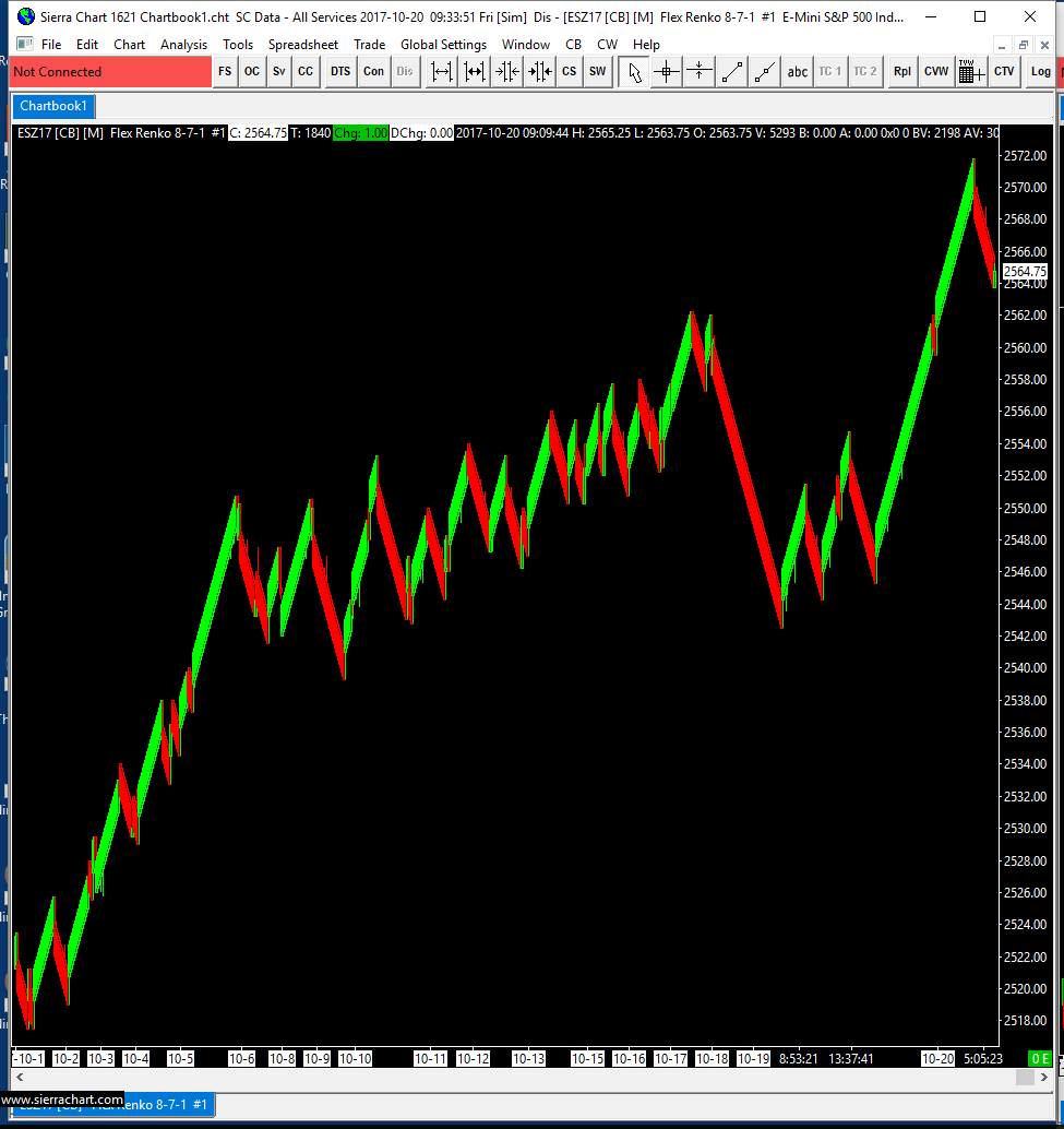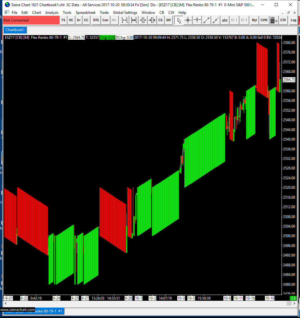 You need to disable New Bar at Session Start in Chart >> Chart Settings. We are sure there is not a problem with Flex Renko bars in 1625. We are not here to make Renko bars work exactly like they did in the prior version. Do not count on that. We are here to properly implement Renko bars according to specifications and according to how Sierra Chart normally creates chart bars. Please understand that. They are properly implemented at this time. That we are certain of. If there is an issue, the charts you provided do not provide any evidence of that because we cannot use a comparison to what existed previously as a basis. The basis must be an explanation of the underlying tick by tick data, in relation to the documentation and what you then see with the current version for Flex Renko bars. The previous implementation of Renko bars had at least one issue, and was not a proper implementation. It was done by one of our other programmers who is no longer with us and who did not implement these consistent with other chart bars in Sierra Chart, and the code was not of the best quality to put it kindly. It had to be rewritten. Sierra Chart Support - Engineering Level Your definitive source for support. Other responses are from users. Try to keep your questions brief and to the point. Be aware of support policy: https://www.sierrachart.com/index.php?l=PostingInformation.php#GeneralInformation For the most reliable, advanced, and zero cost futures order routing, *change* to the Teton service: Sierra Chart Teton Futures Order Routing Date Time Of Last Edit: 2017-10-20 19:34:58