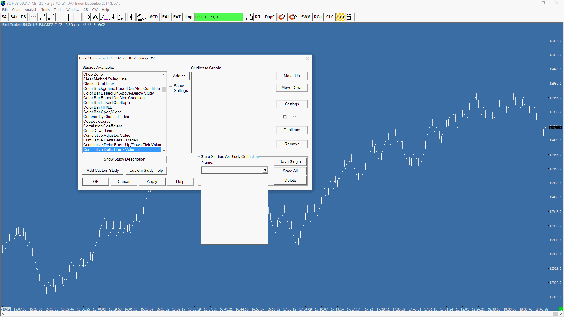 I have read and done what the help page is saying about this situation, but it seems no help. I have removed everything as you can see form the enclosed "ChartStudies.gif" file. And after I press <Add Custom Study> button I will receive the error in log. Please see enclosed "CustomStudies.gif". Recompile, program restart or new chart does not give any help. There is only 1 chart in the chartbook with no spreadsheets or anything else. Date Time Of Last Edit: 2017-10-19 16:04:24