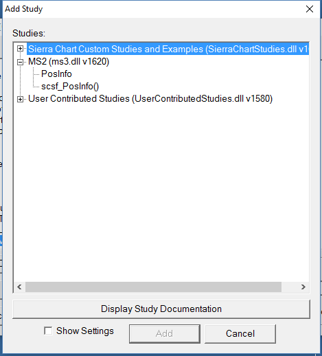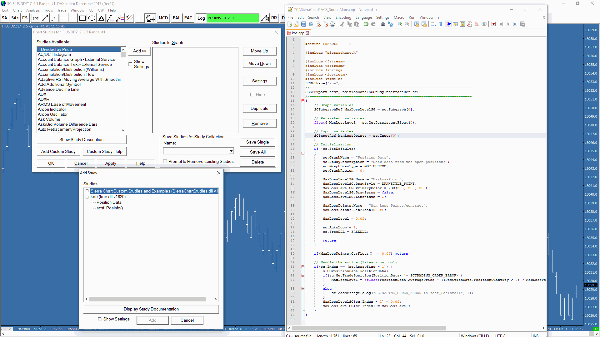 Now I removed all the previous DLL:s, rebooted the whole machine, did a fresh new "Koe" DLL and went to new fresh chartbook with a new fresh chart (without any StudyCollections) and tried to add custom function from the "Koe" DLL to the chart. Please see the attached picture about the situation. Log file has an error about the haunting scsf_PosInfo() function. |