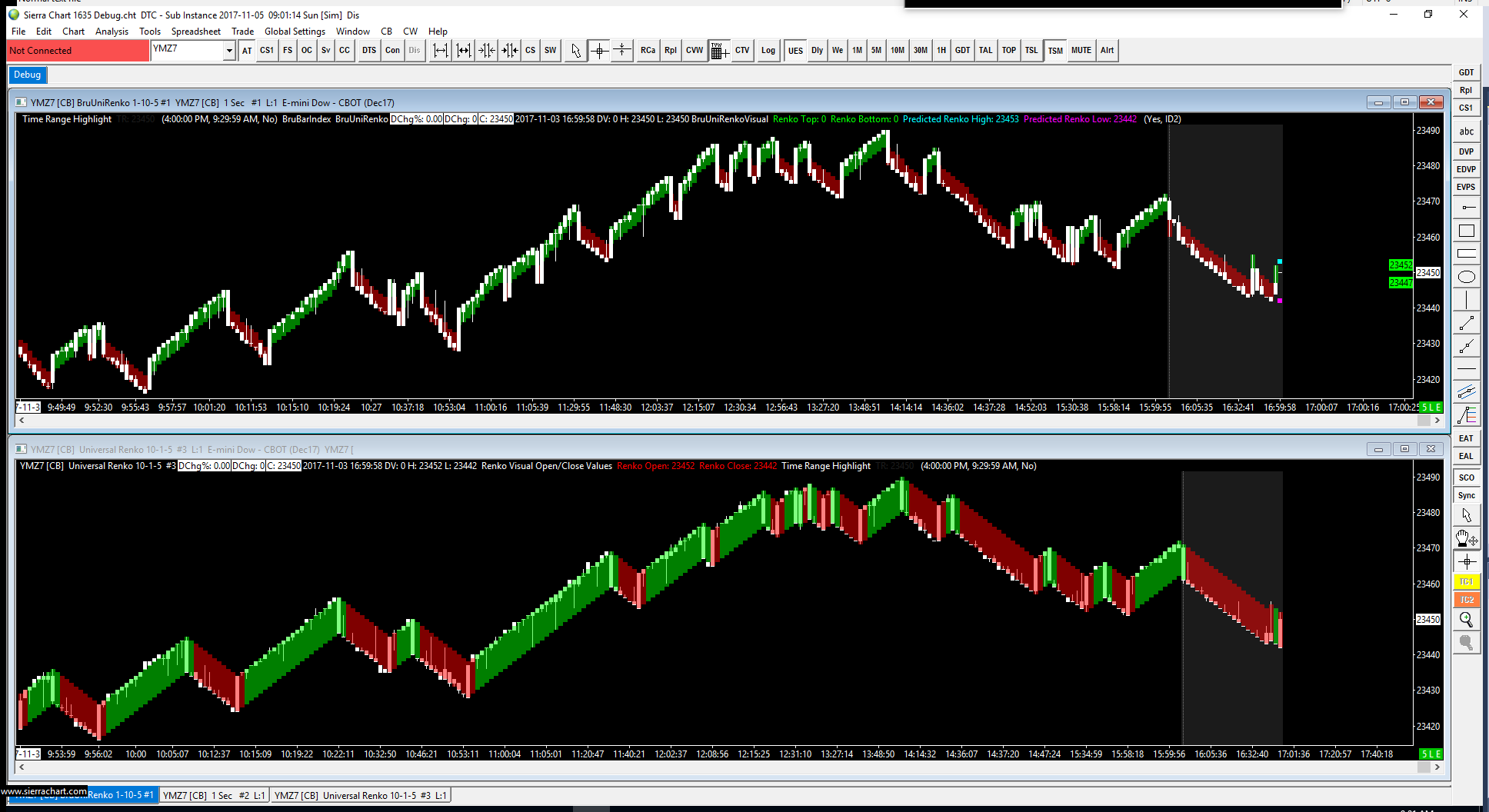 OK, with filling of gaps as documented in the section we linked to in the prior post, and a small correction related to bar splitting that we just made now but not released, this is what we currently see: http://www.sierrachart.com/image.php?Image=1509743402731.png So everything should be 100% good in the next release. Sierra Chart Support - Engineering Level Your definitive source for support. Other responses are from users. Try to keep your questions brief and to the point. Be aware of support policy: https://www.sierrachart.com/index.php?l=PostingInformation.php#GeneralInformation For the most reliable, advanced, and zero cost futures order routing, *change* to the Teton service: Sierra Chart Teton Futures Order Routing Date Time Of Last Edit: 2017-11-03 21:32:49