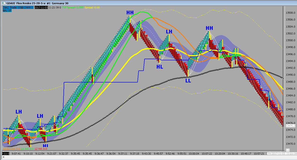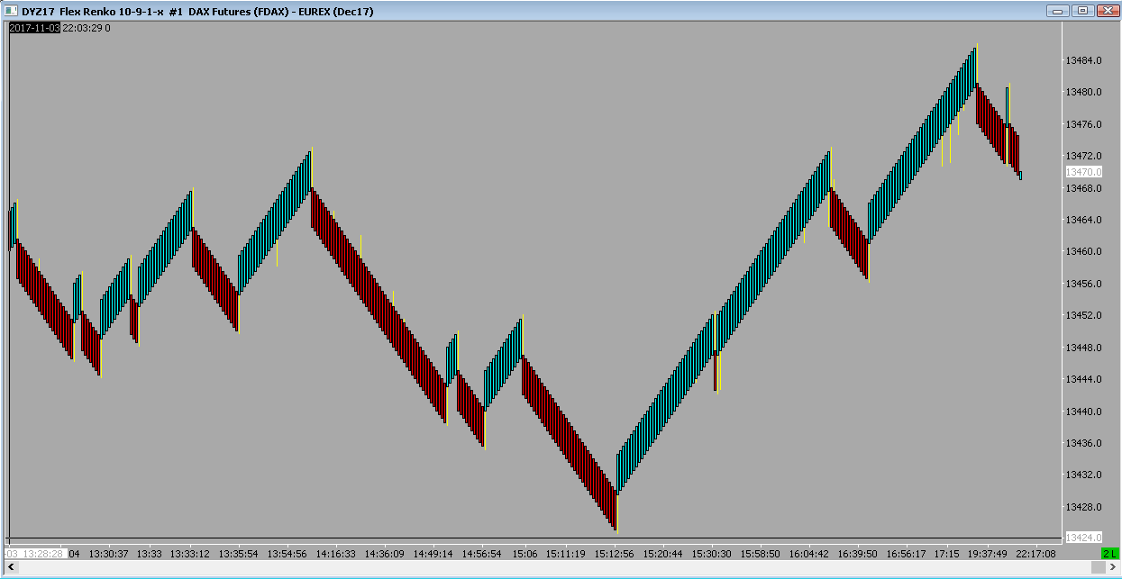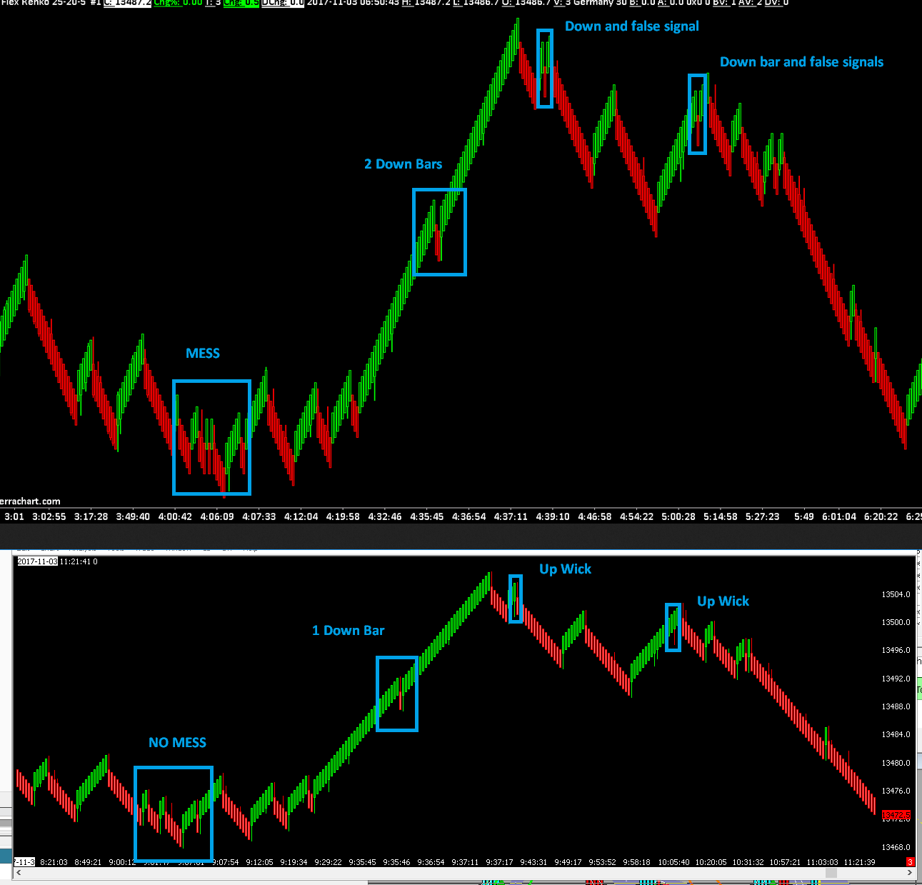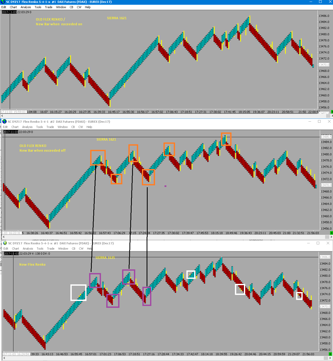 I made a new chart outlining differences between 1621/1635 versions, using DAX futures chart (GDAXI has half tick prices because its (bid+ask)/2 so it can have its own issues). So let's focus on the basic futures chart, tick size 0.5 It seems the new Flex Renko is almost like the old Flex Renko with "New Bar When Exceeded" disabled. I didn't see any way to reenable it. However, even when comparing to the old version with "New Bar When Exceeded" disabled, there are still 2 modifications : * Wicks on the wrong side of the candle (white rectangles). I think you corrected that in the last build (your chart on post #4)? * Reversal wicks are not the same (see orange vs purple rectangles) |
