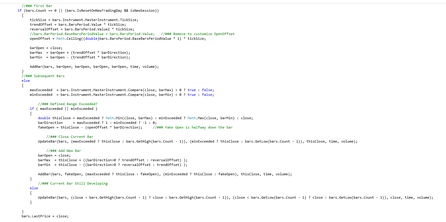 I see a number of Ninjatrader charts on threads of people having issues with the new Renko bars. There are also NinjaTrader charts on Renko threads , from people trying to emulate the NinjaTrader UniRenko bars in Sierra. The UniRenko bars available on NT are quite famous, are mentioned in a lot of trading blogs, are used in multiple thousand-post long threads on trading forums. I think you guys need some UniRenko equivalent bars, people need it, they see them everywhere on trading forums. Before your big Renko update, the UniRenko bars could be 99.9% emulated using the Flex Renko and the "New Bar When Exceeded". You needed to fiddle a little with the settings, but you could find a setting giving a 99.9% good emulation. With your new "correct" implementation, this emulation is no longer available. The bars are not the same any more. So yes, maybe now they are built to be conformant to how a SC bar 'should' be built, but I'm disappointed my long-working Sierra UniRenko is broken. So we all have a different meaning of correct. For me, and probably other Sierra users, "correct" Flex/Univeral Renko bars are those that were available up to 1621. Those that could mimic NT's UniRenko. For you, correct means "conformant to the documentation that we write". Is this really what traders want ? Hope you guys will let us have our UniRenko bars back.. For what's worth here is the Ninja Code for the bars : |