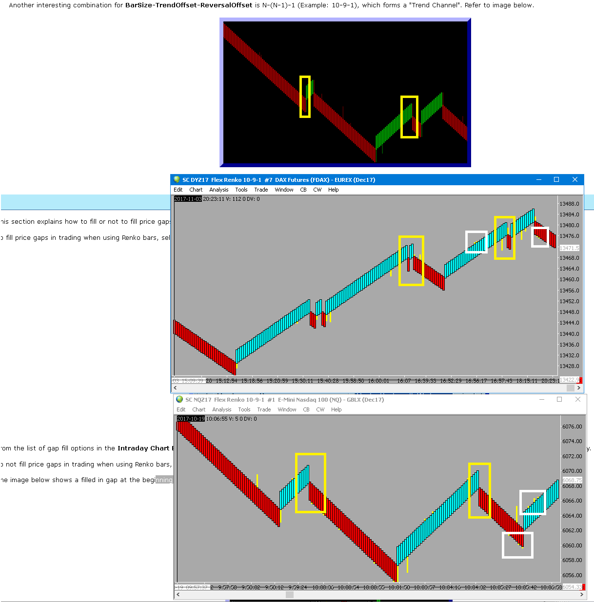 I tried to reproduce the chart you posted on the documention using a N - N-1 - 1 ( 10-9-1) Flex Renko chart. The current implementation does not show the same bars as the documentation. The posted pic on the doc site has *full candle reversal wicks (yellow rectangles) *no wick on the wrong side of trend. The actual charts on NQ and DAX have *no full candle reversal wicks (yellow rectangles) *wicks on wrong side of the trend (white rectangles) By the way, because of the name, shouldn't we be expecting to be able to build Ninja-like "UniRenko" bars with something you called "Universal Renko". If not, that name is quite misleading... There were plenty other names available. |