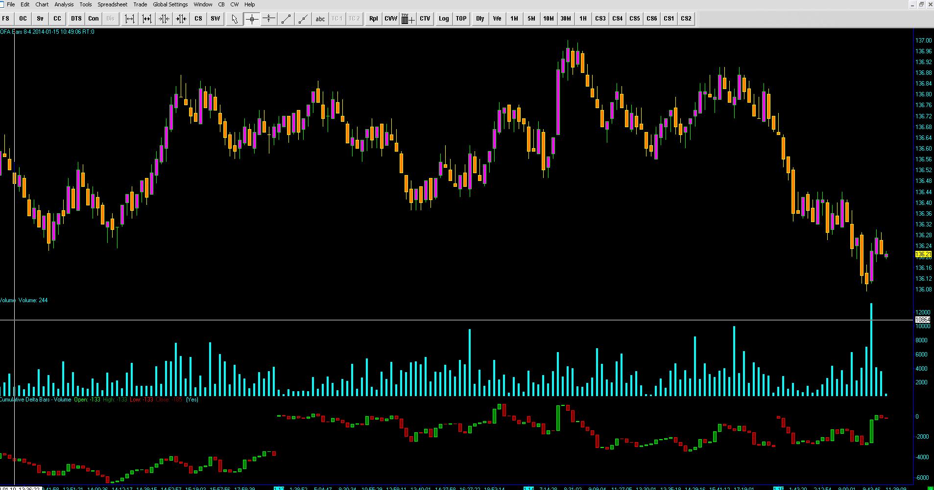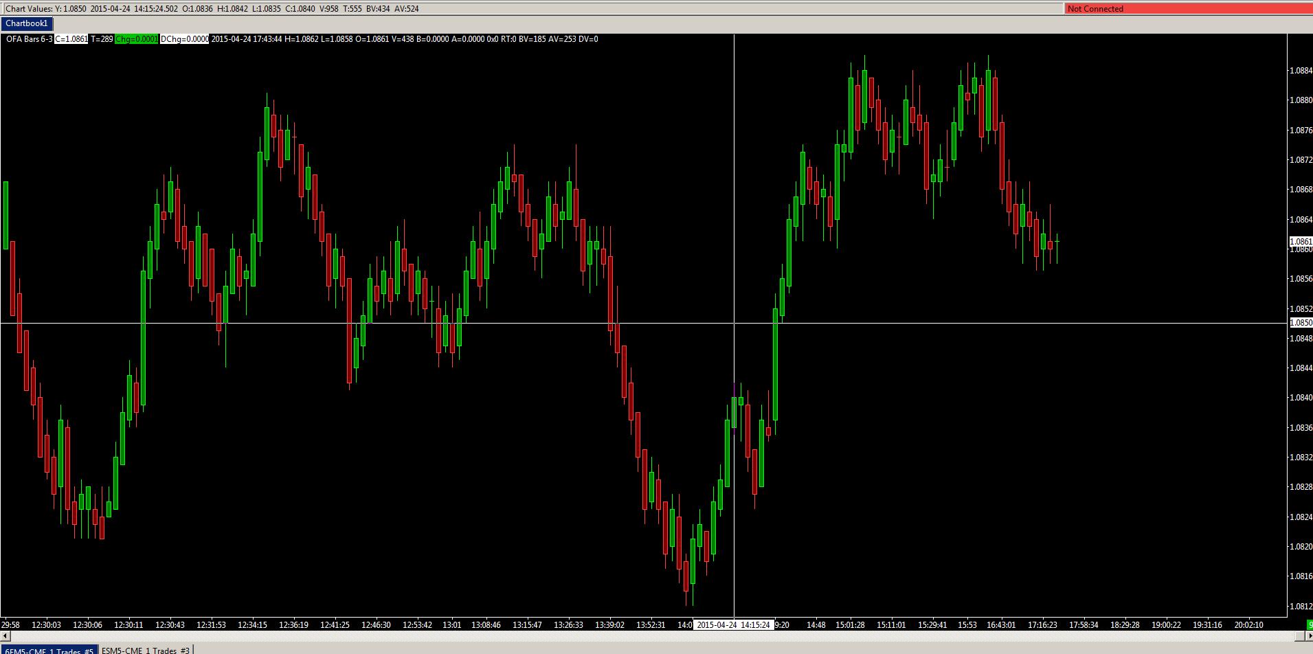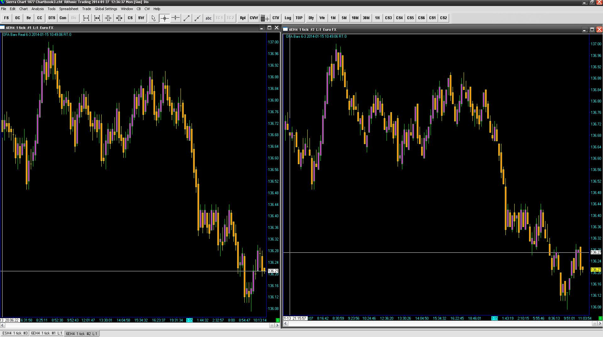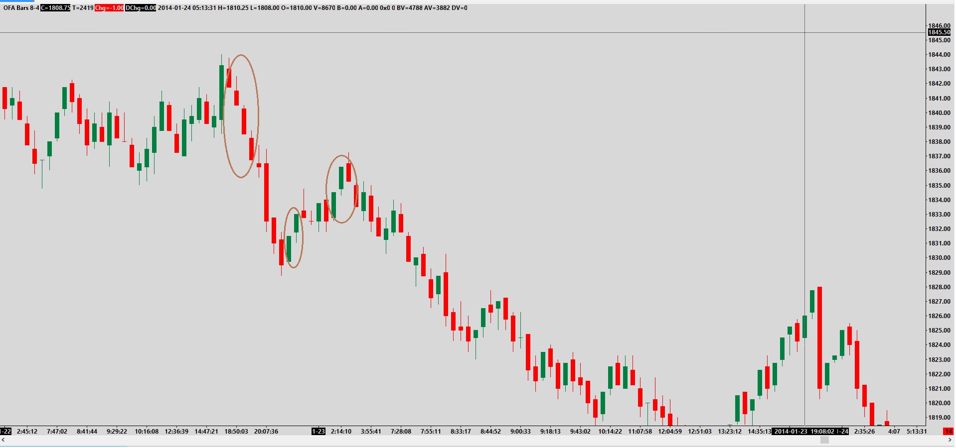 OFA 6/4 Bars require that the price goes up 6 ticks consecutively and then pull back 4 ticks to start a new bar. So if it goes up 3 and then back one the count is started over for the 6 consecutive ticks. the 6 can be in either direction but has to uptick or downtick without reversing at all once the 6 ticks have been hit. After that happens a new bar is printed when 4 opposite directional ticks has happened. These would be done on reversal bars.