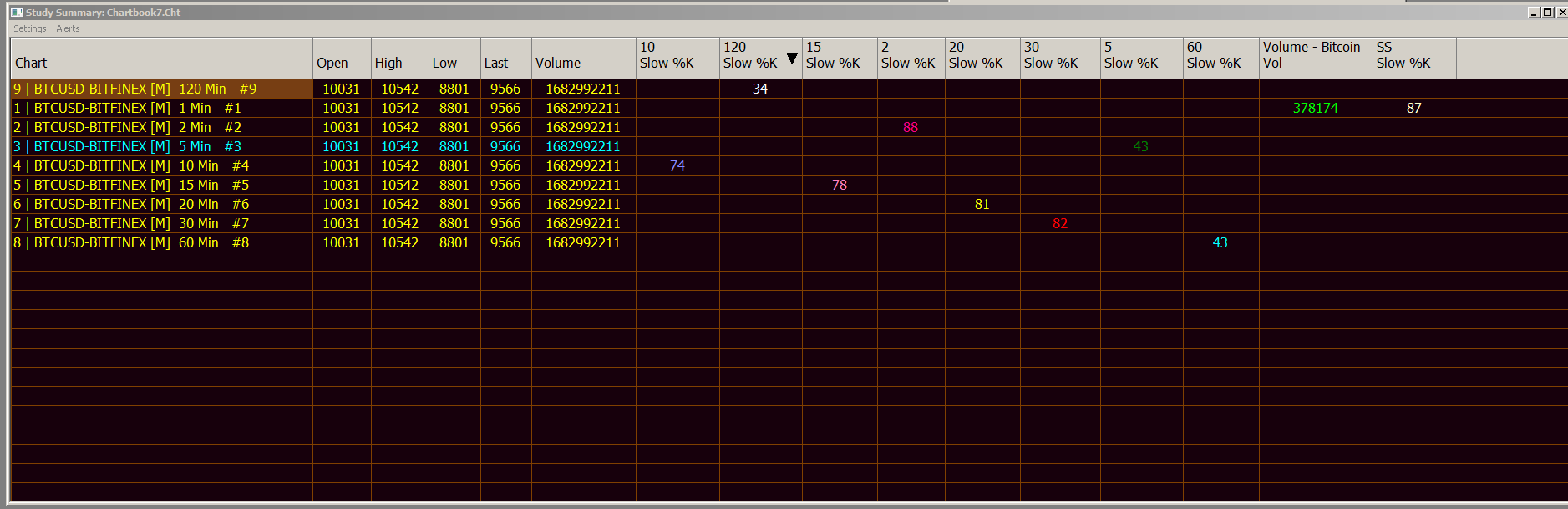 Different instruments with the same studies on them line up nice in the columns. But the same instrument in different time-frames with the same studies don't line up at all. If you hide a study it wont show up in the study summary window. You should be able to see it in the summary window but not have to have it on the chart. If you use a study price overlay then you have to set the "Fill blanks with last value" to yes to get the data...but then the study looks all stair-steppy on the chart so you have to put two of them on the chart and hide the one that has the "yes" setting. Ordering the studies from different charts is difficult. We should be able to order them the way it is useful for us. I want to order multiple time frames in order of time from 60m to 15m to 5m etc, not by chart number. To do that i had to open a new chartbook and duplicate the time-frames to the new chartbook in the order i wanted them -- but then even though they all had one study on them, none of them lined up nor could be made to have an arrangement that was useful. How do you get rid of the OPEN HIGH LOW LAST and VOLUME columns ?-- its not necessary to have them for more than one time-frame instance of the same instrument. Here's an image to help you understand what I mean. Date Time Of Last Edit: 2017-11-30 18:57:12