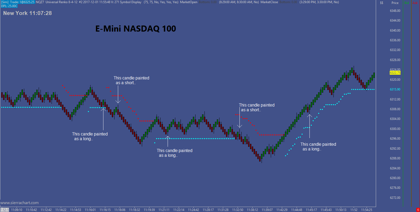 Sierra Support, I'm having difficulty coding a single bar being painted, and could use some help. If you would take a look at the link, you'll see what I'm trying to accomplish: http://www.sierrachart.com/image.php?Image=1512410850433.png Currently, when I use the color bar based on alert condition, my problem is that it's painting all of the bars in a direction after the Kiwi's Trailing Stop reverses. How would I code: singling out the first down candle after a pullback on a short Kiwi reverse? Also, how would I code: singling out the first up candle after a pullback on a long Kiwi reverse? Thank you. |
