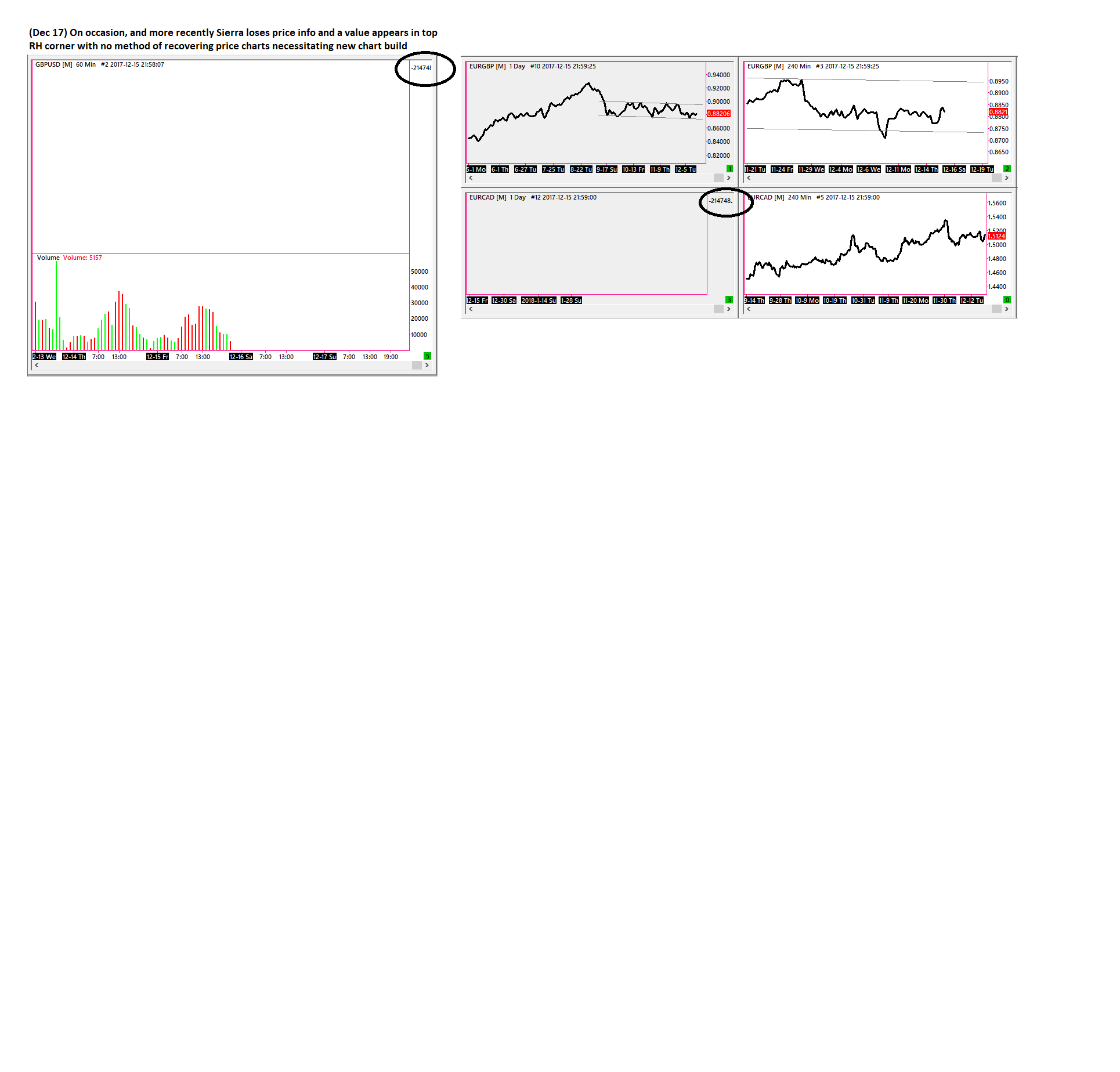 Hello Sierra Some time ago, I had issues with price Data simply disappearing and just leaving a value of 214748 in the top right hand corner of the particular chart concerned. This problem went away, but since your last update has reappeared and I have lost a number of charts in the last few days that needed rebuilding. Rebooting of Sierra makes no difference. The event happens whenever I have just conducted an action on the chart - particularly if I change the view. It does not matter what Symbol I'm in either Can you help please? - PLEASE FIND ATTACHED SCREEN SHOT Thanks - Mark |