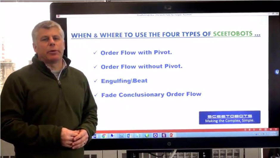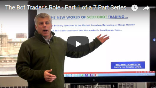The Role of a Bot Deploying Trader - Part 1 of a 7 Part Series http://sceeto.com/blog/the-role-of-a-trader-who-utilizes-bots-part-1-of-a-7-part-series/ In this episode of the series we discuss how in the new world of bot trading: 1. Traders no longer trade. 2. Traders assess market conditions and deploy bots. 3. It is the bots job to trade. How in This New Trading Paradigm, the Trader’s Primary Question is the Market Trending, Reversing, or Range Bound? If the trader assesses that the market is trending up, then… Deploy Long Trend Friendly Bots. If the trader assesses that the market is likely to reverse at a known level, then… Deploy Reversal Friendly Bots. If the trader assesses that the market is range bound, then… Deploy Mean Reversion Friendly Bots, or Simply Stand Down. Four types of SceetoBots to start with… + Order Flow with Pivot. + Order Flow without Pivot. + Engulfing\Beat + Fade Conclusionary Order Flow |