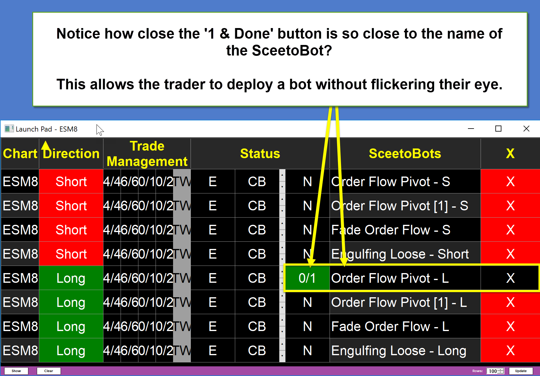 Feature Upgrade Notification - Re-jiggered Launch Pad for easier Touch Screen Use We have just published a new build of SceetoBots which will be downloaded to user's machines the next time that they restart Sierra Chart. The new build re-jiggers the columns in the SceetoBots Launch Pad so that the name of each SceetoBot is directly next to the bot's deployment buttons. For users of touch-screen monitors this allows for less eye movement from away price actin when a trader wants to deploy a bot. I keep the Launch Pad very close to price and I have noticed this tweak makes deployment of bots much easier. As I have recently switched from a custom keyboard which I used to deploy bots, which had a tactile feel and did not need me to look away from the chart to deploy bots, to a touch-screen, I have noticed that the placing the Launch Pad close to the current price improves accuracy and makes things easier. Note We are also looking into adding a level of transparency to the Launch Pad so that it can hover directly over price - if the trader so chooses. Also, we are building a very touch-screen friendly 'BreachBot' that we hope to beta in the next 2 weeks. Keep an eye out here for more details on the BreachBot. Sierra Chart Rules! |
