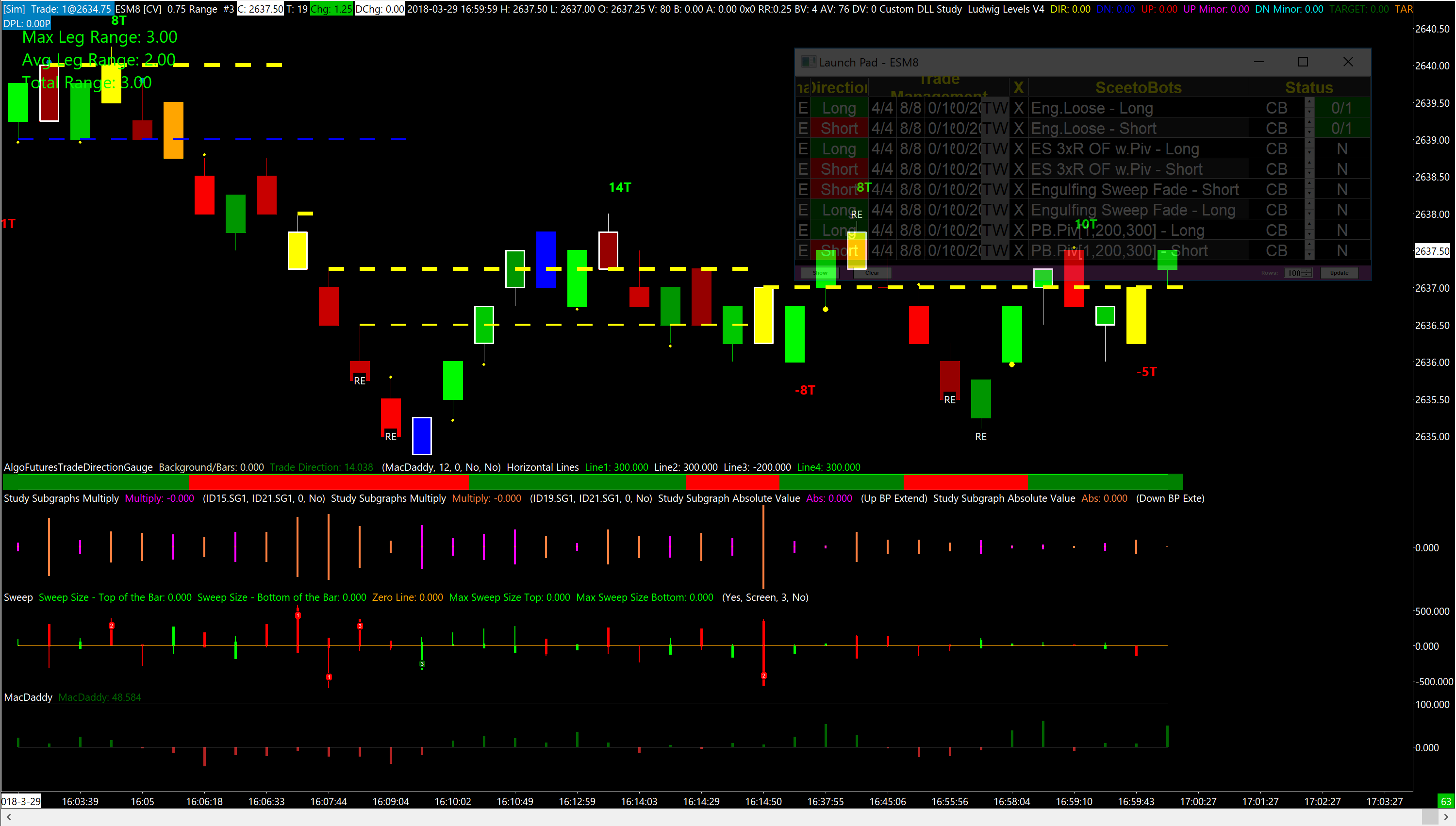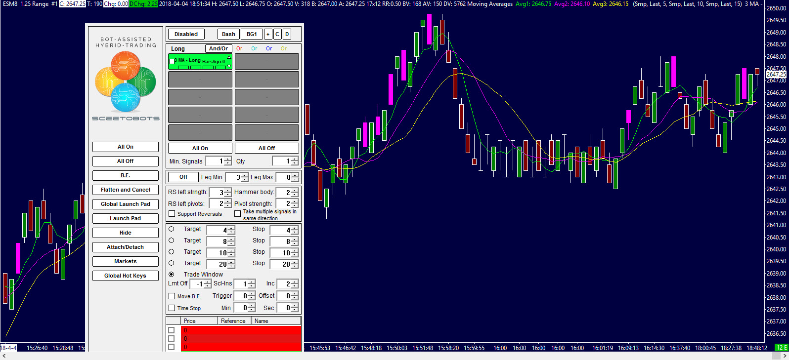 14-AUG-2018 - New Functionality Released BreachBots Beta - Trimmed Down GUI (We are down to 1 button to manage this bot). BreachBots Beta - BreachBot now supports hotkey combinations. BreachBots Beta - Low level execution fixes New SceetoBots Alert - 2 Standard Deviation Tick Ratio New SceetoBots Alert - Sweep 1,2,3 In the Development Queue A 'Stand-down' button is being added to the Launch Pad....this button will allow the trader to tell all enabled bots to turn themselves off once any one bot sends an entry order. This will keep folks, particularly me, from forgetting to turn off bots. Date Time Of Last Edit: 2018-08-14 23:57:49