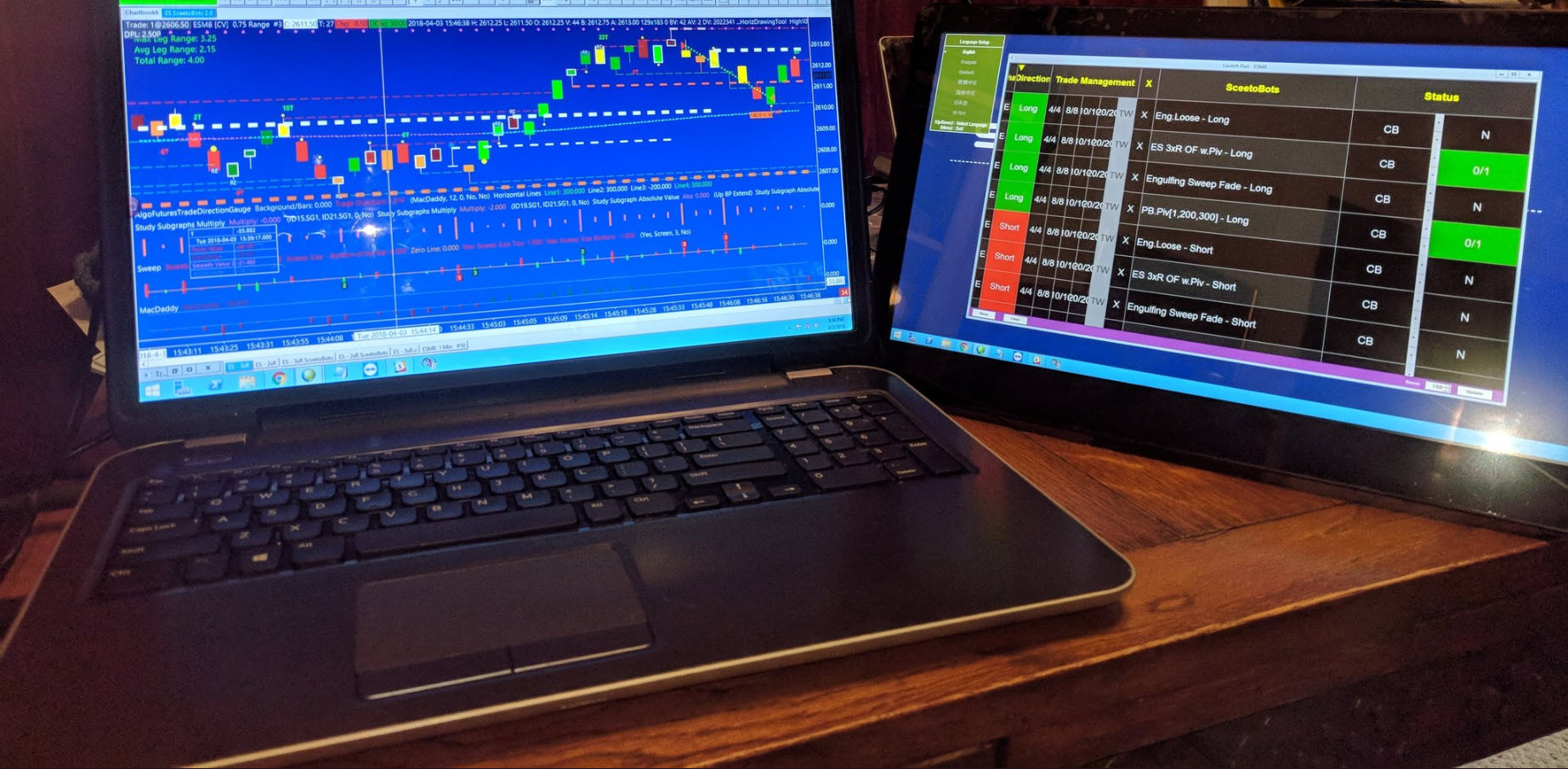 GeChic Road Testing - Initial Findings I like the GeChic very much...though I have only a few hours of trading with it. Last week I used it at a sitting desk...this morning I am moved some stuff around so that I can use it with my treadmill desk - which is where I like to do most of my trading. Last week, I found that it has made the afternoon trading (3-4 Eastern) much more pleasant. The monitor ships with a short cord...which I did not realize. So, if you get one, you may want to consider ordering the longer cord. I trade mostly on a 3 tick range bar chart....but plan on using the GeChic to help me to get down to either a 2 tick or a 1 tick....which would be very cool. Our order flow algos, which feed the bots, hold up quite well on the 2 tick, and surprisingly can provide good information on the 1 tick, The jury is still out as to whether the transparency of the Launch Pad is a good thing or not. I also see the benefit of having more flexibility with regards to allowing the user to re-configure columns in an ad-hoc fashion for the Launch Pad. This became apparent when I moved the Launch Pad to the right of the chart, and found that the execution buttons were way out in right field. I do miss some aspects of the physical keyboard....the tactile-ness of it, and also all of the other keys that I built into it such as Buy Bid, Buy Ask, Disable All, Flatten & Cancel. I have re-attached my physical keyboard so I am now using both the GeChic and the Cherry, So, in a nutshell, the jury is still out. Attached is a picture of my current configuration with the GE Chic on my treadmill desk, which is my 3rd iteration this morning, which I like very much - but can still use some improvement. The GeChic is on the lower right and is attached to a laptop that is to the right of the desk and out of the shot. I am connected to a co-lo server in CHI from the desk via RDC. The laptop, which has the GeChic connected to it, is connected to the server via TeamViewer. With this config, I think that we are in a zone where scalping is very solid. For instance, this trade's duration was 524 milliseconds: Entry DateTime Exit DateTime GCM8 Long 2018-04-09 10:22:07.071 2018-04-09 10:22:07.595 1336.8 1337.1 1 1 1 24.80 74.40 40.00 0.00 40.00 0.00 100.00% Caveat - This was filled by the Transact Sim server in Chicago (see Trade Activity Log graphic). Regardless, the order was not filled locally via SC's sim engine - which means the order had to leave the co-located Sierra Chart server and be processed by the Transact (all within 6/10 of a second), this includes: + Signal generation + Creation of order + Transmittal of order + Receipt of order + Filling of entry + Placing stop and target + Hitting target + Cancelling stop I like this model because if I had to send the order from VT to Chicago, instead of the bot sending the order from Chicago to Chicago, the transmission time would be 10-20 ms, and thus, this type of trade would never fill. Date Time Of Last Edit: 2018-04-09 21:18:07