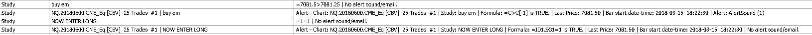 This does not make sense. On the Trading System Based on Alert Condition, use this Alert Formula directly on that study itself: 1 When a new bar is added to the chart, there will be an order signal. And there is going to absolutely be logging as well if there is not. You cannot possibly fail. The study works very reliably. Sierra Chart Support - Engineering Level Your definitive source for support. Other responses are from users. Try to keep your questions brief and to the point. Be aware of support policy: https://www.sierrachart.com/index.php?l=PostingInformation.php#GeneralInformation For the most reliable, advanced, and zero cost futures order routing, *change* to the Teton service: Sierra Chart Teton Futures Order Routing Date Time Of Last Edit: 2018-03-06 06:29:20