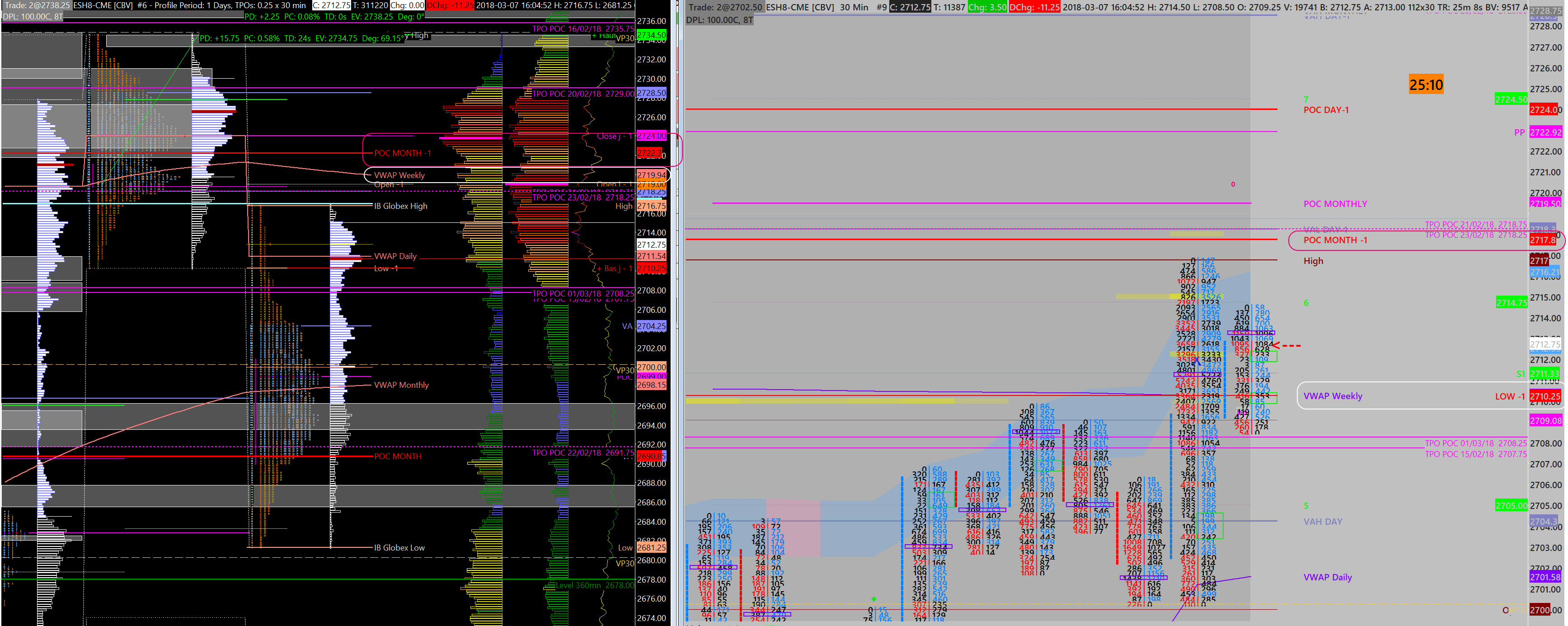 Hello Support, I wish to share a problem relating to levels between a Market Profil (TPO Profile) and a Footprint 30mn chart. I have please the exact same Studies in them. As you can see on the attached image, surrounded by a red and white shape, to POC MONTH-1 and the VWAP Weekly are not at the same price level ! I have setted exactly the same way both of the 2 charts: same geographical area, same volumes type, same trading hours sessions, ecc. I have attached also the 2 study collection relative to the MP & Footprint. I would be grateful if you can resolve this matter, as non reliable levels can be very dangerous for surviving in such hard environnement. Thanks. Date Time Of Last Edit: 2018-03-07 15:17:15