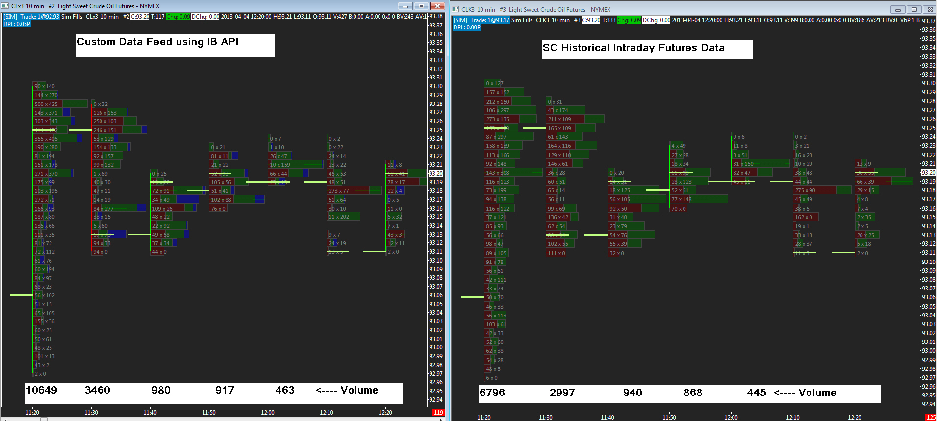A lot of postings deal with volume issues with Interactive Broker's datafeed. SC developers have indeicated that the data feed is missing trades, so the volume is understated. To compensate, SC adds phantom trades to make up for this missing volume. The SC developers have suggested that alternate brokers or alternate data feed providers be used if the quality of IB's data feed is inadequate. Unfortunately if you reside in Canada (especially British Columbia), there are very few alternate brokers available to replace Interactive Brokers and provide comparable trade commissions. I have never been convinced that IB's data feed could not be improved, so I created my own data feed using IB's API. The resulting feed data differs quite significantly when compared to Sierra Chart's version of the IB data feed. To measure the accuracy of the data feed, I have compared the feed to Sierra Chart's two data feed backfill services: SC Historical Data & SC Futures Backfill Data. Using the crude oil futures symbol, CL, I created 10 minute bars using the four different data feeds, and compared their volumes: 11:10am 11:20am 11:30am 11:40am 11:50am SC real-time feed using IB data 15878 9574 1141 1146 2228 My custom real-time data feed using IB data 10649 3460 980 917 463 SC Historical Data (backfill) 10572 3462 979 908 463 SC Futures Backfill Data (backfill) 6796 3997 940 868 445 I found that none of the data feed matched exactly, including Sierra Chart's two historical data feeds. However the closest match is my custom data feed and SC historical data. Sierra Chart's r/t feed using IB data does not come close to matching any of the other feeds, and is consistently overstated. I believe the addition of phantom trades by SC is the cause of the large volume numbers. I have attached two screen shots of the 10 minutes charts using the various data feed, showing the market profiles of the bars. The shots show that my custom data feed matches SC futures backfill data fairly closely, while Sierra Charts data feed using IB data does not. I hope this information illustrates my point that a better data feed using Interactive Broker's data feed and API can be created. My programming skills as rather crude, so I am sure the SC developers would have not problem improving upon my attempt. I can submit details about the coding of the custom data feed if anyone is interested. -BD |