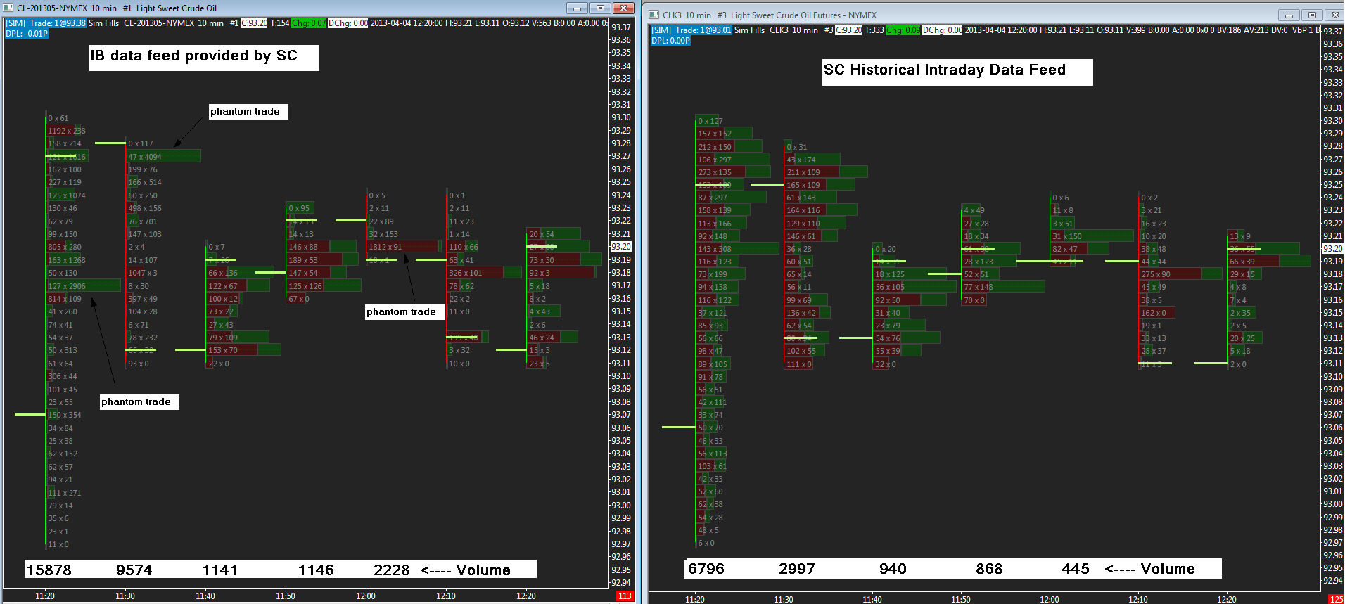 There used to be a way to disable this, but we force this feature on because if someone inadvertently disables it, then we would receive feedback from them asking why their chart bars look sparse and incomplete. So unless IB has changed the data feed, we would likely think that you would keep the option on. Although, we want to provide you the capability to do your own evaluation. The problem with this is that if you find you need to keep this on, we might as well take the option out. This is now supported in the latest Sierra Chart version: Quote: When using the Interactive Brokers Trading service, this functionality to simulate a trade in order for the Intraday chart volume to match the Daily Volume messages, has shown to cause volume spikes in Intraday charts. Therefore, this can be disabled for Interactive Brokers. To disable this, uncheck Global Settings >> Data/Trade Service Settings >> More Interactive Brokers Settings >> Simulate Trades to Match Daily Volume. Actually, there is a way to disable this. Enable Global Settings >>Data/Trade Service Settings >> More Interactive Brokers Settings >> Record True Real-Time Data in Intraday Charts. More information about this here: http://www.sierrachart.com/index.php?l=doc/IB.php#TrueRealTimeData Unless you use Record True Real-Time Data in Intraday Charts, that we advised you to. Why do not you use it? Here is the documentation once again for this: http://www.sierrachart.com/index.php?l=doc/IB.php#TrueRealTimeData How is it that you overlooked and disregarded what we said. Please explain. There is nothing new here. We provided solutions. We assumed you followed our suggestions and you continued to indicate there was a problem with the data feed, and we said this is an IB problem , which is correct if you continued to have an issue after following our instructions, so there was nothing for us to do. And there still is not. We have for years, based on user feedback heard about incomplete data from IB. So we know there is and has been a problem. Maybe they have made some improvements which seem to be indicated in your testing. There was a good reason why Sierra Chart would simulate trades to match the daily volume messages. This was implemented many years ago based upon how the data feed from Interactive Brokers worked many years ago and this information was explained to us by a user. What TWS would do, is when the price does not change they do not send a new price but instead just increment the daily volume. So the only accurate way to chart it was to do processing with the daily volume messages. We are just providing some background here. This may not be necessary currently or in the CL Futures market. Sierra Chart Support - Engineering Level Your definitive source for support. Other responses are from users. Try to keep your questions brief and to the point. Be aware of support policy: https://www.sierrachart.com/index.php?l=PostingInformation.php#GeneralInformation For the most reliable, advanced, and zero cost futures order routing, *change* to the Teton service: Sierra Chart Teton Futures Order Routing Date Time Of Last Edit: 2013-04-05 17:50:54