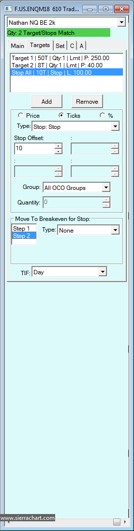 Thanks for the response. After a few additional hours of troubleshooting I figured it out: The first target (further away) was assigned to OCO group 1 and the second target (closer) was assigned OCO group 2. I simply reversed things so that OCO group 1 was assigned to the closer target and OCO group 2 was assigned to the more distant target. The problem existed because: Although add-ons were added to the closer TARGET the STOPS for the add-ons were added for the second target. Hence when the first target was hit, all add-ons were covered but excess buy/sell stops were left over. And when the final target was hit the excess buy/sell stops remained -- and could be filled if price reversed (not cool). I don't know if this would be considered a bug or a misconfiguration on my end. Here's the steps to reproduce, if it helps: STEPS TO REPRODUCE ------------------- 1 - Create target 1 at 50 ticks away and assign to OCO Group 2 2 - Create target 2 at 10 ticks away and assign to OCO Group 1 3 - Create a 10 tick "stop: stop" assigned to "all OCO Groups" 4 - Save config 5 - Enter long and quickly add on 6 - First target is assigned 3 contracts and second target is assigned 1 contract 7 - ?? > First target is reached but 3 sell stops remain. EXPECTED > 1 sell stop remains 8 - Second target is reached and 2 sell stops remain 9 - Price reverses and sell stops are filled |