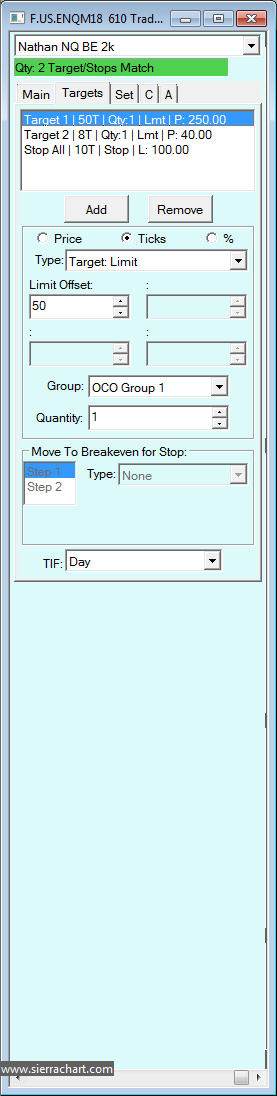 Howdy, If I place an order, then add-on more orders, once my first target is reached there is an excess number of buys/sell stops left over. After my final target is hit, the excess stop orders still remain and if price comes back they get filled -- which is not intended of course. Not sure if I'm doing something wrong with my trade configuration or if there's a bug. My strategy is configured for "support scale in" and "support scale out". Please see screenshots illustrating the issue and my configuration. Trade confituration: * http://www.sierrachart.com/image.php?Image=1527281331201.png * http://www.sierrachart.com/image.php?Image=1527281434958.png * http://www.sierrachart.com/image.php?Image=152728145361.png * http://www.sierrachart.com/image.php?Image=1527281283456.png * http://www.sierrachart.com/image.php?Image=1527281369249.png Illustration of problem (mark-up of live issue): * https://photos.app.goo.gl/8pKRw6CoT4xhjQ3b2 * https://photos.app.goo.gl/aQ8t1tXgdYtRDNRU2 Thank you, Date Time Of Last Edit: 2018-05-25 21:37:53