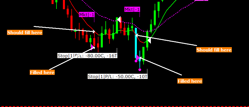 Hi SC, My Autotrade is set to Buy/Sell as soon as price action touches the moving average. I've tried it with both of these codes: 1. CROSSFROMABOVE(L,ID2.SG1 For a long entry on the MA(ID2.SG1) I have Evaluate on Bar close Only "No" 2. ID2.SG1<=H,ID2.SG1>=L for a long entry on the MA (ID2.SG1) I also have Evaluate on Bar close only "No" The bars are "coloring" correctly as an alert, however, the entries using Autotrade are WAY WAY off in many instances. Sometimes on NQ it's entering 10-14 ticks above the MA for a long trade. I'm attaching a typical situation. Any help, advice, or ideas you have would be greatly appreciated! John |