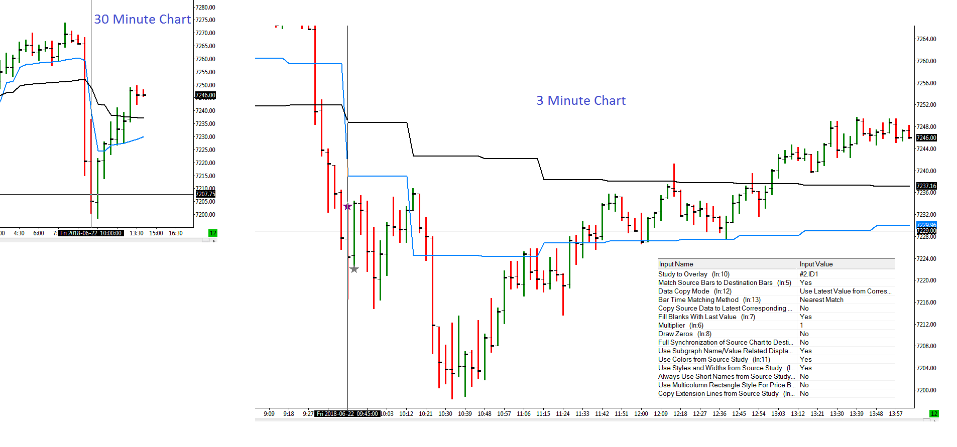 I am attaching an example of a 30 minute chart crossover on a 3 minute chart. After the crossover on the 30 minute bar is done at 10:00 AM, it shows up on the 3 minute chart at 9:45 AM. Is there anyway to calculate the 30 minute bar value on the 3 minute chart to reflect crossover at 9:45 AM in real-time instead of waiting for 30 minute bar close? I am attaching the Study Overlay settings and snapshot of the example |
