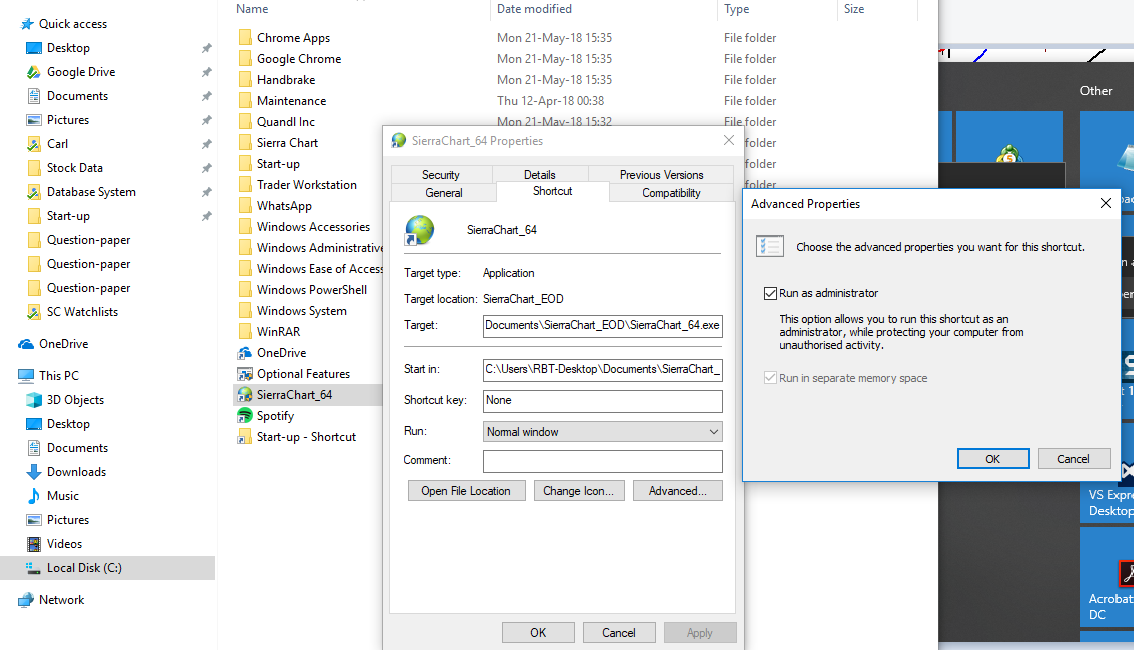 If you receive the following error in the Window >> Message Log, then either uncheck the Global Settings >> General Settings >> Periodically Set System Date-Time from Server option or set Sierra Chart to run with administrator level access (explained below). This error is an indication that the operating system permissions or version is not allowing a program to set the system Date-Time. Additionally, I noticed tat my Shortcut to the 64 bit version wasn't set to Run as Administrator. To do this, I have created a simple Screenshot. This was the problem. Ensure this is set to Administrator as this was causing my chart not to show the latest data. Presumably the connection failed because my Clock was somehow set incorrectly. |