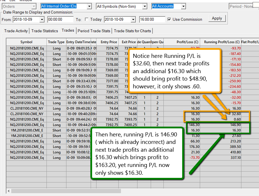 For the record we did have the call and upon further review of this screenshot: https://www.sierrachart.com/Download.php?Folder=SupportBoard&download=22959 We can see that actually the Running Profit/Loss is correct per unique Symbol and Trade Account pair. It is necessary to look back at the prior PL for that same Symbol and Trade Account to see that. So at this point this support request is now considered complete. And we are doing additional work on trades list and trade statistics which should be out today or tomorrow. Sierra Chart Support - Engineering Level Your definitive source for support. Other responses are from users. Try to keep your questions brief and to the point. Be aware of support policy: https://www.sierrachart.com/index.php?l=PostingInformation.php#GeneralInformation For the most reliable, advanced, and zero cost futures order routing, *change* to the Teton service: Sierra Chart Teton Futures Order Routing |