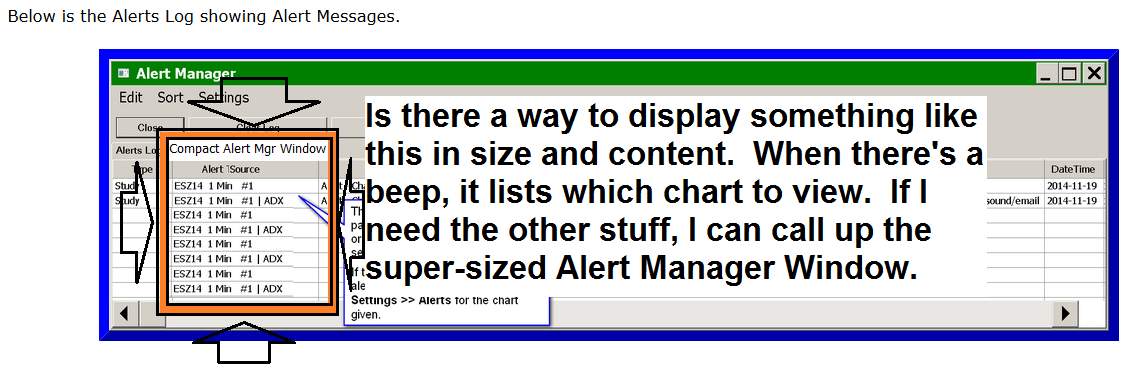 The Sierra Chart Alert Manager window footprint takes a lot of screen real estate. Tabs, menus, headers, title bars, that are static, no new info. Is there a way to make it more compact? https://www.sierrachart.com/images/AlertsLogWithStudyAlertExample.png Examples of compact Alert Text wanted, - headers are unnecessary during use. . . Symbol, Timeframe and Chart Number, custom study "Formula" " ABCD, 10 min #14, BURG-SHT LMNO, 30 min #7, GRUB-LNG and so on . . . " Can Do? Is there a work-around a user can kludge together? Does a user forum address this configuration stuff? Thanks, Alerts Manager The long version of message above. The Sierra Chart Alert Manager window footprint takes a lot of screen real estate. Vertically, we have rows of "knobology" like tabs, menus, headers, title bars, that are static, no new info. Is it possible to select and deselect, or put another way, view on and view off that upper section of the Sierra Chart Alert Manager window and realize a huge immediate footprint reduction? When it comes to the good stuff, the "dashboard" part of the Alert Manager window, Horizontally, access to the updating of the non-static Alerts Log can be of great value. Alerts Log headings: Source, not enough info for purposes here. Alert Text, Tons of info, big forest here DateTime, Type, Examples of compact Alert Text wanted, - headers are unnecessary during use. . . Symbol, Timefreme and Chart Number, "Formula" (something more than the "Source" column's posting of the spreadsheet filename where several custom studies slave away" " ABCD, 10 min #14, BURG-SHT LMNO, 30 min #7, GRUB-LNG and so on . . . " Alerts Manager Date Time Of Last Edit: 2018-11-17 15:15:36
