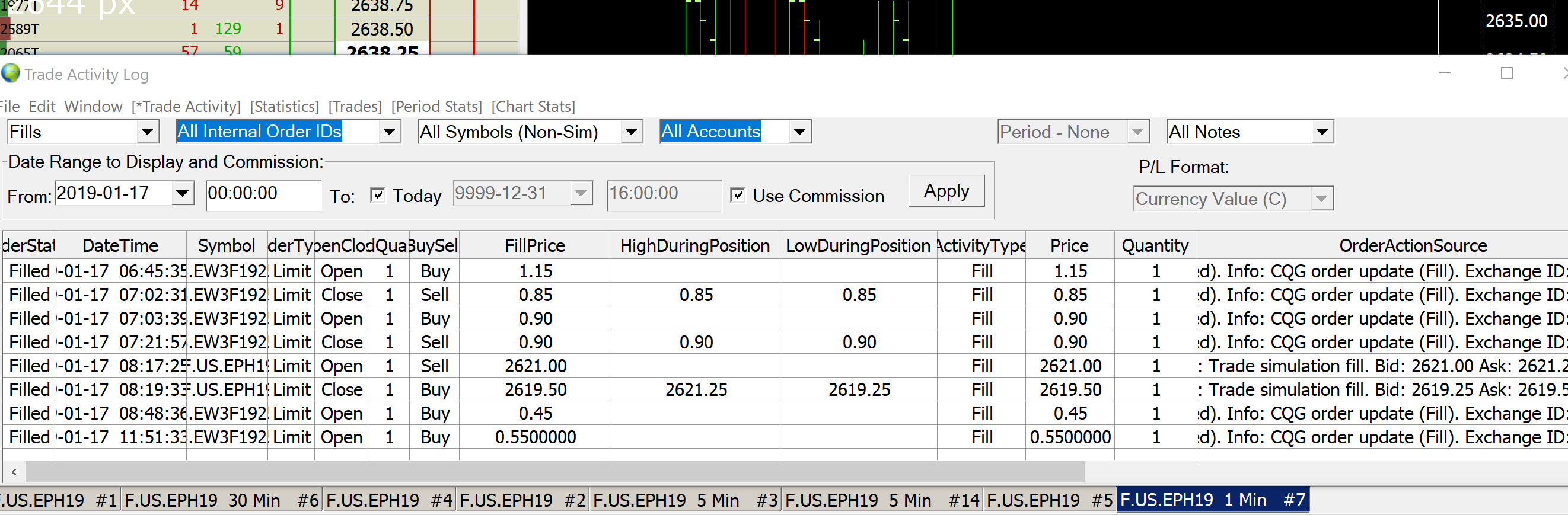 We think that these problems all center around not having the Trade Account on the Trading DOM in the sub instances set to your actual account. It is instead set to a simulation account or the wrong account. Check that: Basic Trading and the Trade Window: Main/C >> Trade Account (Selecting Trade Account for Chart / Trade DOM) However, the trade log showed the activity as a [sim] trade, aside the live options trade activity, while the log display setting was set to show all-symbols non-sim. This would mean that the trade was actually simulated. And if you have All Symbols (Non-simulated) selected in the Trade Activity Log, it should not display any simulated order activity in the latest version. We did verify that.