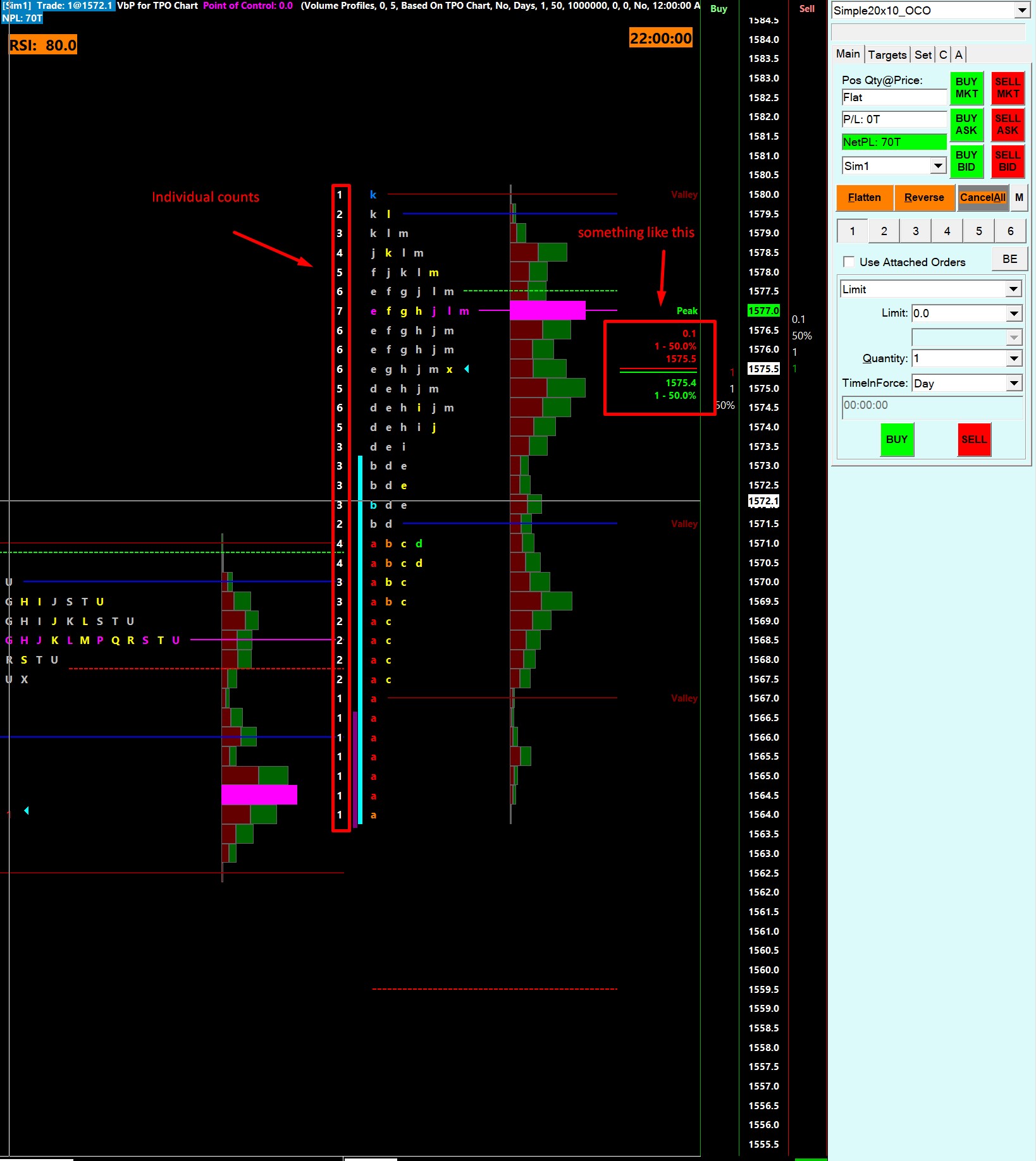 Thank you John and let me ask this then: Can you display info (that info) from the Value window directly onto each day TPO? Alternatively, there is a TPO count option which can be displayed o the left of each TPO so perhaps is there an easy way to display total above/below TPOC?