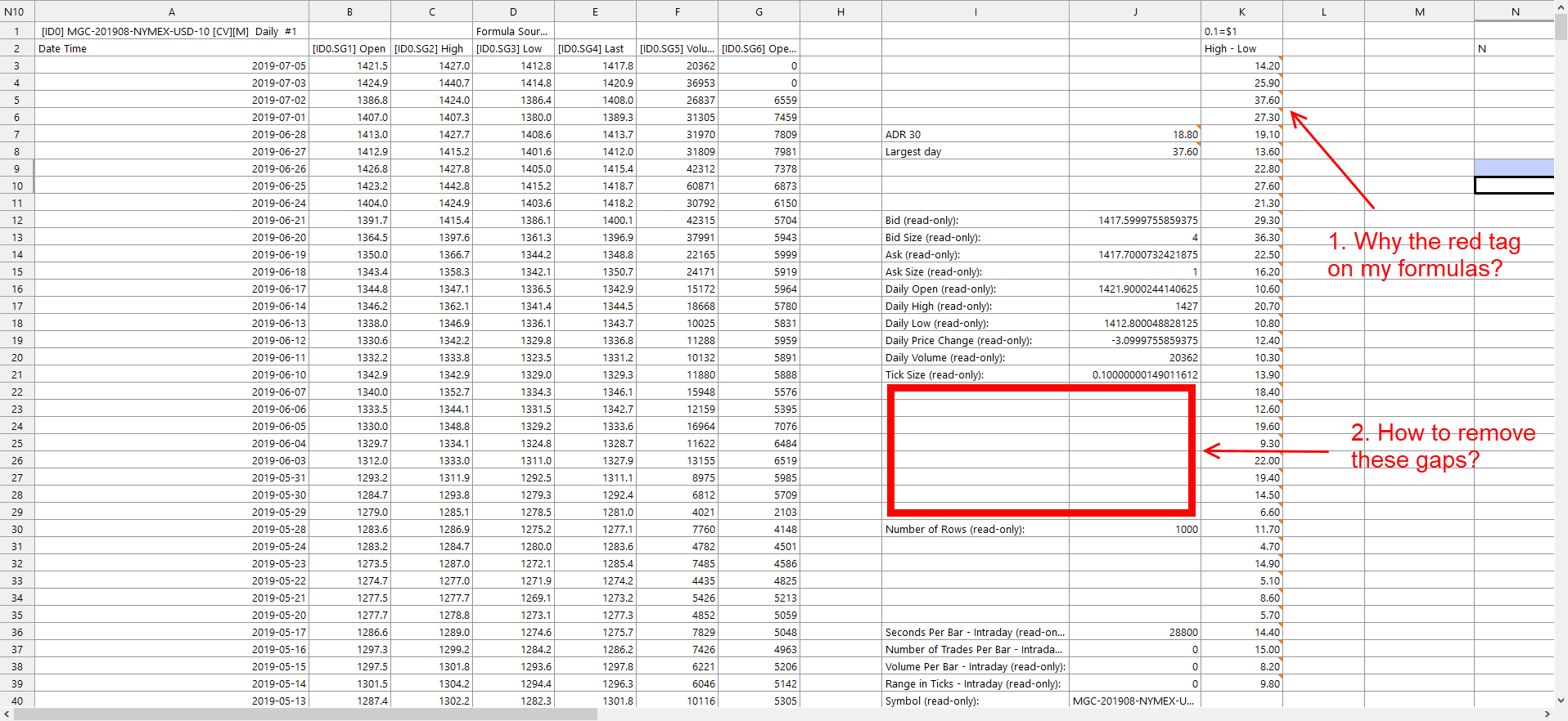 I think you are saying you cannot change the cell functions in J and I, so you cannot remove spaces or change the location of these cells, as they are "special" system functions. The cells in Column J marked "Read/Write" in Column I can have their values changed. For example, J26 controls Order Size. It is normally 1 unless a positive value is saved in the cell. Only the cells labeled "Read-Only" cannot have their values changed. Date Time Of Last Edit: 2019-07-08 15:47:59