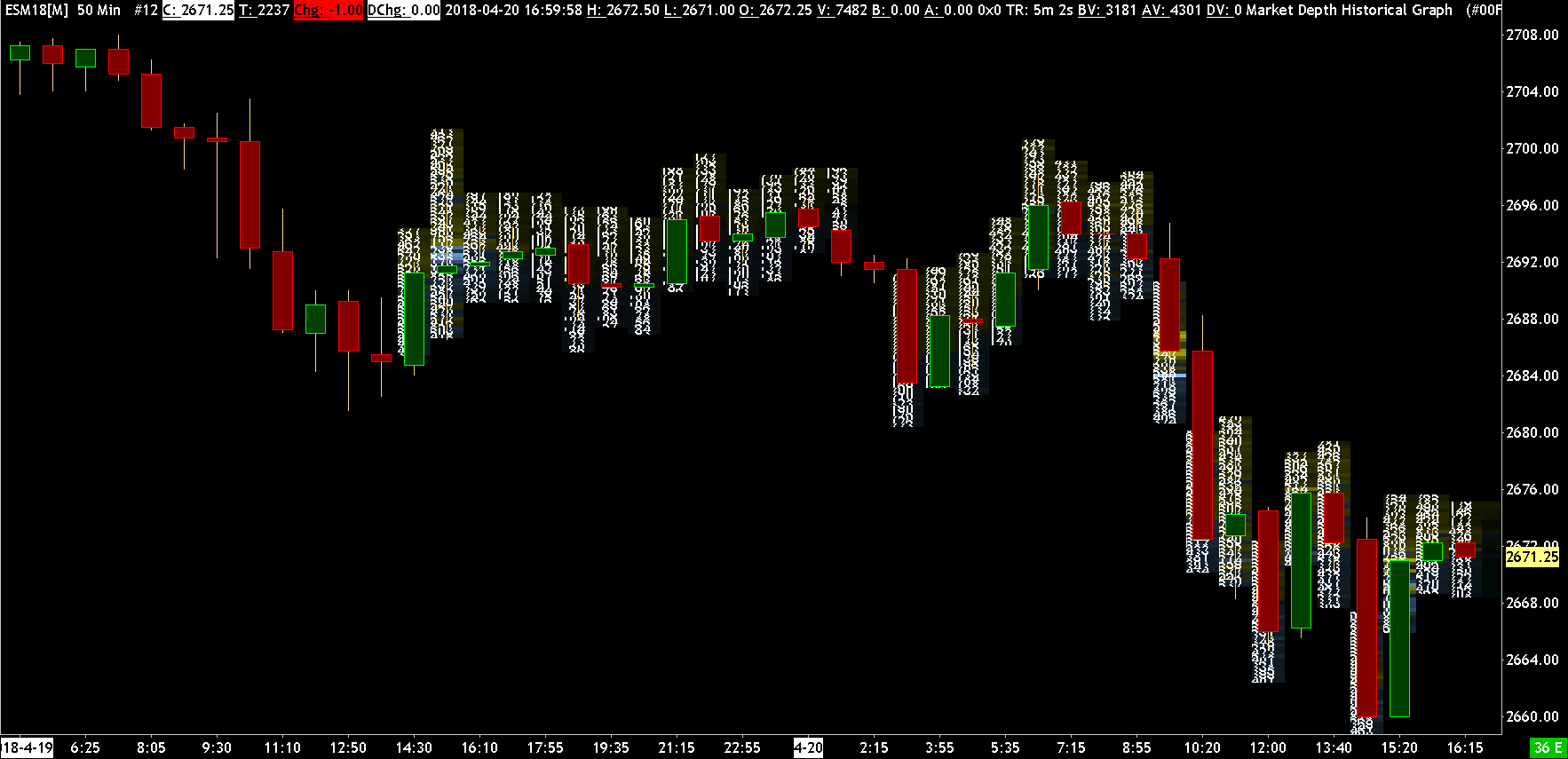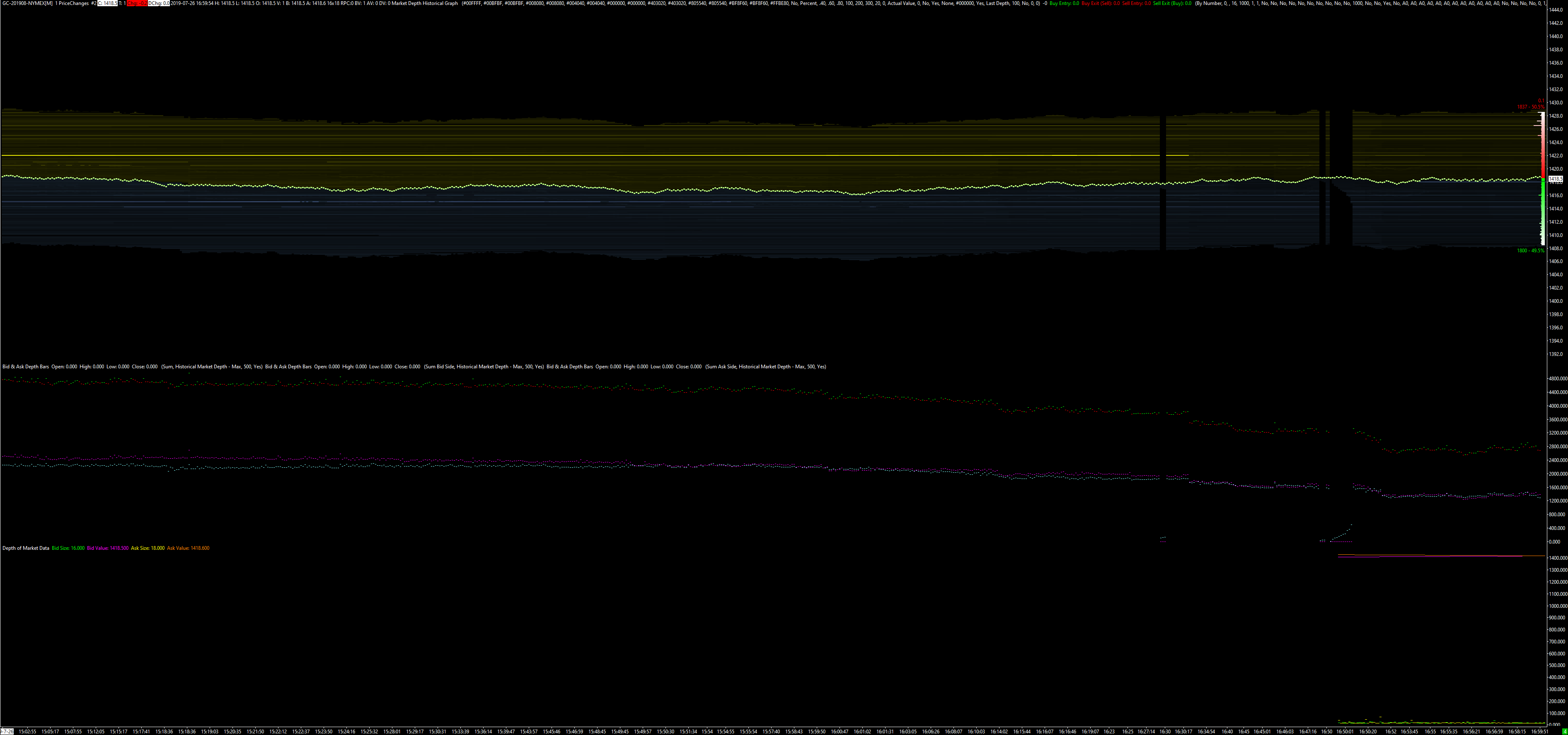 Post #9 is not making any sense to us. Why do you ask that question? And as you can see in this chart image here of the Market Depth Historical Graph study (the numbers are overlapping though): http://www.sierrachart.com/image.php?Image=1564394550986.png in the newer versions of Sierra Chart, this version is 1959, older historical market depth data is still usable in all areas of the program which utilize it, just not with Bid and Ask Depth Bars. This chart shows data from back in 2018. Sierra Chart Support - Engineering Level Your definitive source for support. Other responses are from users. Try to keep your questions brief and to the point. Be aware of support policy: https://www.sierrachart.com/index.php?l=PostingInformation.php#GeneralInformation For the most reliable, advanced, and zero cost futures order routing, *change* to the Teton service: Sierra Chart Teton Futures Order Routing Date Time Of Last Edit: 2019-07-29 10:06:24