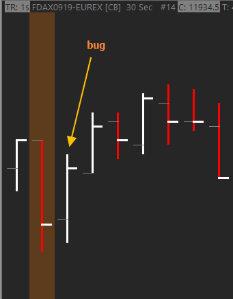 Dear Sierra, I think I Found a bug when using the Drawstyle “DRAWSTYLE_BACKGROUND_TRANSPARENT” on two subgraphs, please find an example and Screenshots bellow. As soon as I set for the first SubGraph the Drawstyle from “DRAWSTYLE_COLOR_BAR” to “DRAWSTYLE_BACKGROUND_TRANSPARENT” the second Subgraph plotting (=display) is ignored. Code Example for better understanding & Testing: SCSFExport scsf_Test(SCStudyInterfaceRef sc) { //================================================================================ //Subgraph Definition //================================================================================ SCSubgraphRef SuGr_A = sc.Subgraph[0]; SCSubgraphRef SuGr_B = sc.Subgraph[1]; //===================================================================================================================== // Section 1 - Set the configuration Variables and Default Values // This section is only run once. Refer to documentation for further details. //===================================================================================================================== if (sc.SetDefaults) { //================================================================================ //Set the Defaults for Sierra //================================================================================ sc.GraphName = "Test"; sc.StudyDescription = "Test - Bug found for SC"; sc.GraphRegion = 0; // Use the main price graph region (0 means Chart Region 1, 1 means Chart Region 2, maximum value can be 7=Region 8) // Setting sc.AutoLoop to 1 (true) means looping is performed automatically. This means that if there are 100 bars in your chart, this function is called 100 times initially. sc.AutoLoop = 1; // 1=true //During development set this flag to 1, so the DLL can be rebuilt without restarting Sierra Chart. When development is completed, set it to 0 to improve performance. sc.FreeDLL = 0; //================================================================================ //SubGraph Properties //================================================================================ SuGr_A.Name = "SuGr_A"; //SuGr_A.DrawStyle = DRAWSTYLE_COLOR_BAR; SuGr_A.DrawStyle = DRAWSTYLE_BACKGROUND_TRANSPARENT; SuGr_A.LineWidth = 1; SuGr_A.PrimaryColor = RGB(255, 128, 0); //Orange SuGr_A.DrawZeros = false; SuGr_B.Name = "SuGr_B"; SuGr_B.DrawStyle = DRAWSTYLE_COLOR_BAR; SuGr_B.LineWidth = 1; SuGr_B.PrimaryColor = RGB(255, 255, 0); //Yellow SuGr_B.DrawZeros = false; return; } //===================================================================================================================== //Section 2 - Do data processing here //===================================================================================================================== //================================================================================ // Outside & Inside Bar Range Calculations //================================================================================ if (sc.Index == 1) SuGr_A[sc.Index] = true; else if (sc.Index == 2) SuGr_B[sc.Index] = true; else { SuGr_A[sc.Index] = false; SuGr_B[sc.Index] = false; } } Date Time Of Last Edit: 2019-08-04 11:15:57