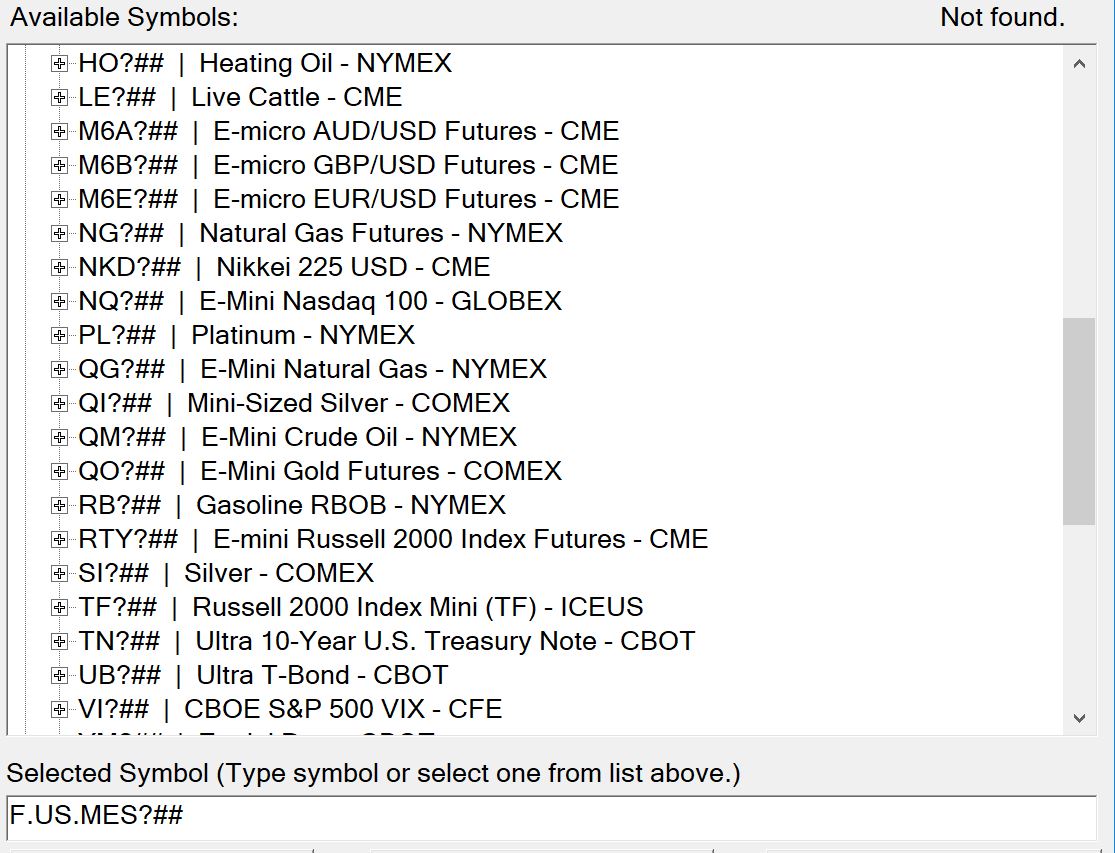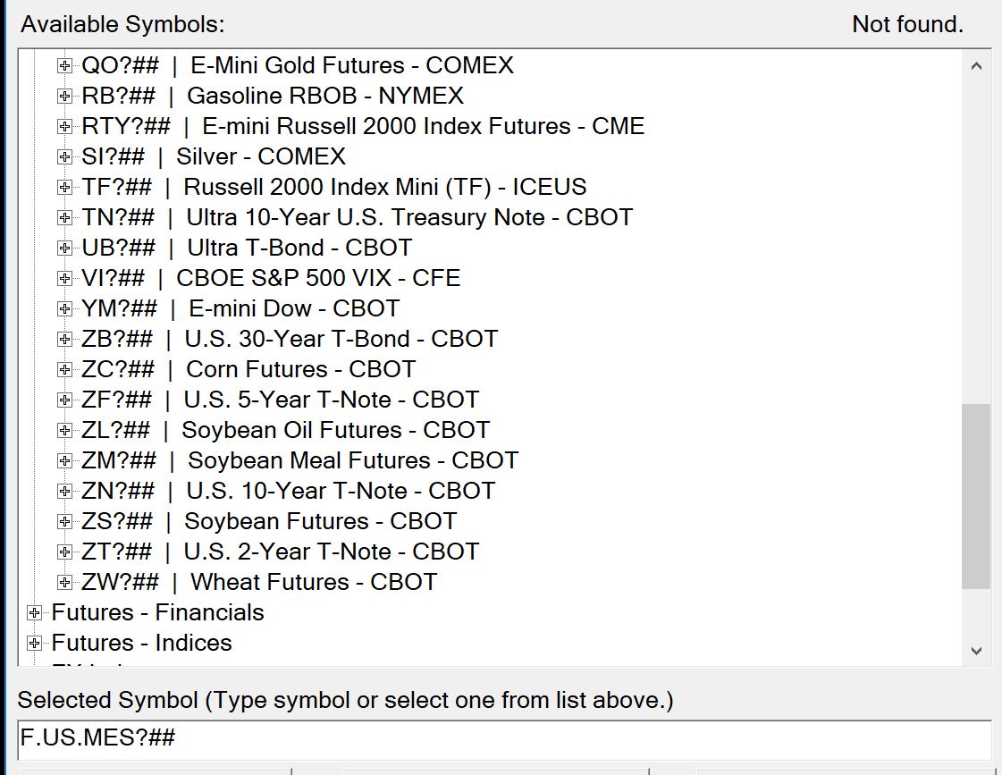 They should be there, and we see them in the list when we pull it up for both Rithmic and CQG. For example, if you are looking for the Micro ES (MES), then if you are using CQG for your data, it would be under the Futures section with a symbol of F.US.MES?##. If you are using Rithmic for your data, then it would be under the Futures section with a symbol of MES?#-CME. For the most reliable, advanced, and zero cost futures order routing, use the Teton service: Sierra Chart Teton Futures Order Routing Date Time Of Last Edit: 2019-08-21 18:24:59