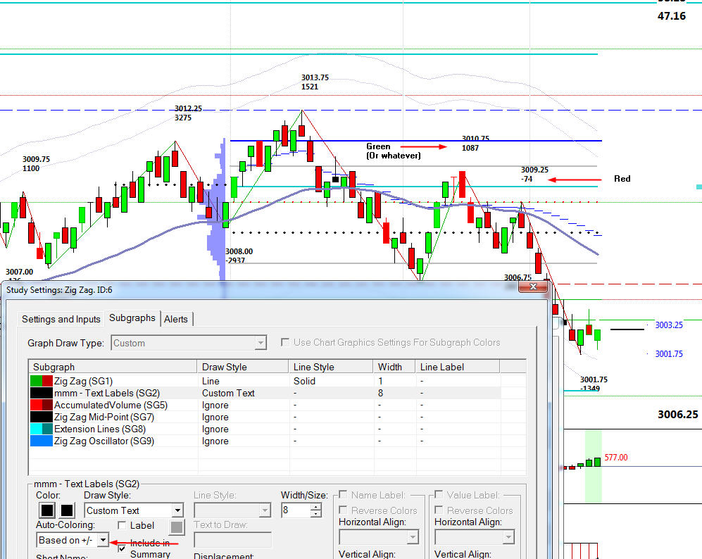 This is also supported already as the default functioning for the display of the text values. Just change your colors for that subgraph (Text Labels) from black to other colors. This is referenced in the documentation here: Zig Zag: Display HH,HL,LL,LH Labels For the most reliable, advanced, and zero cost futures order routing, use the Teton service: Sierra Chart Teton Futures Order Routing Date Time Of Last Edit: 2019-09-20 16:55:57