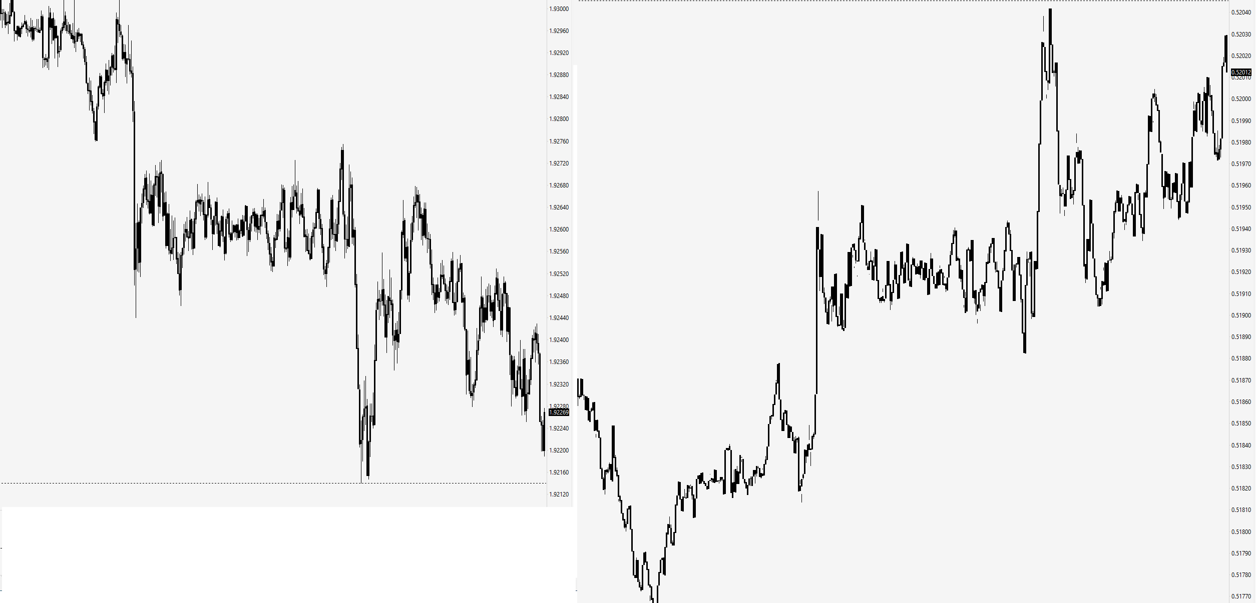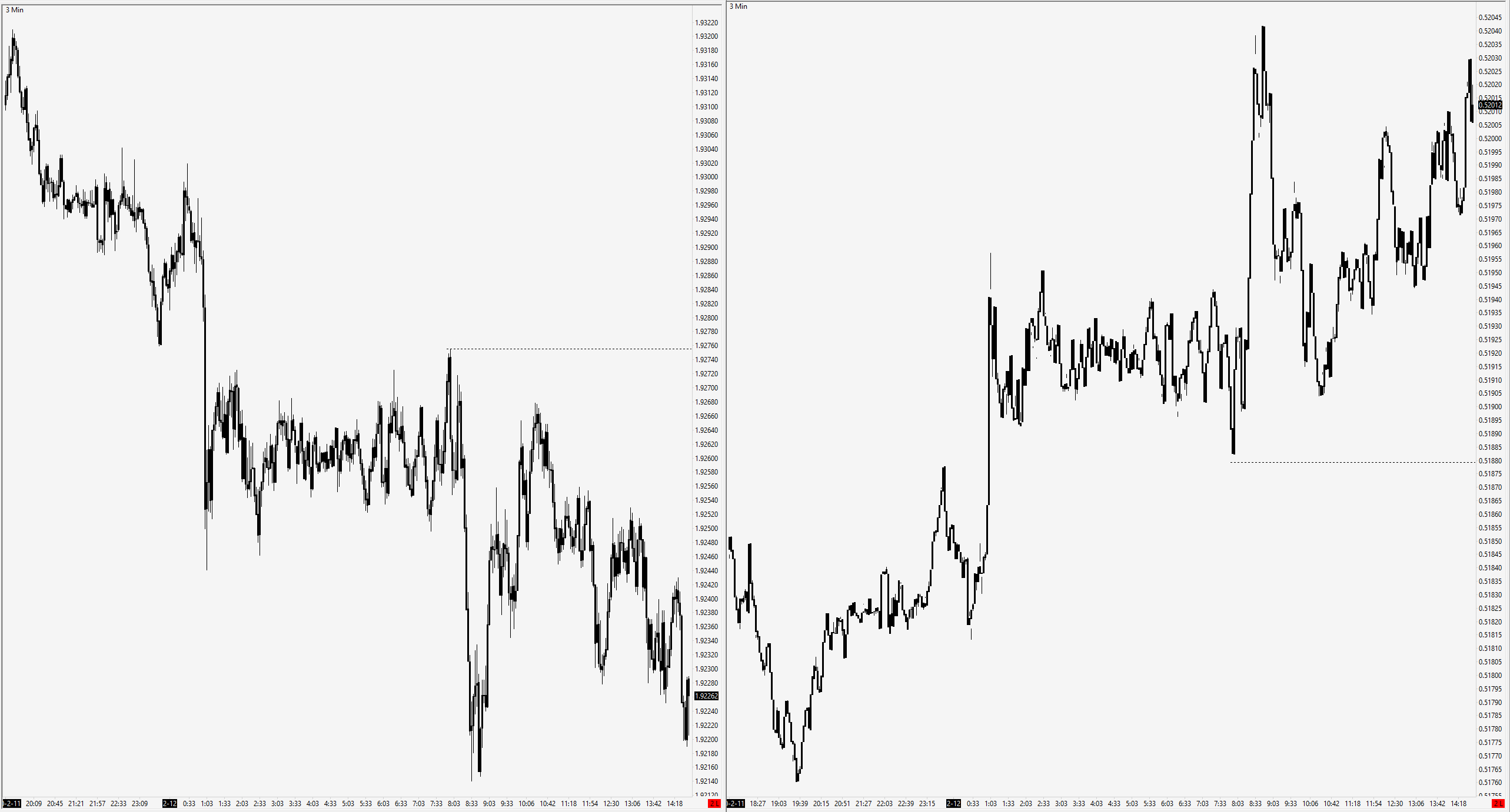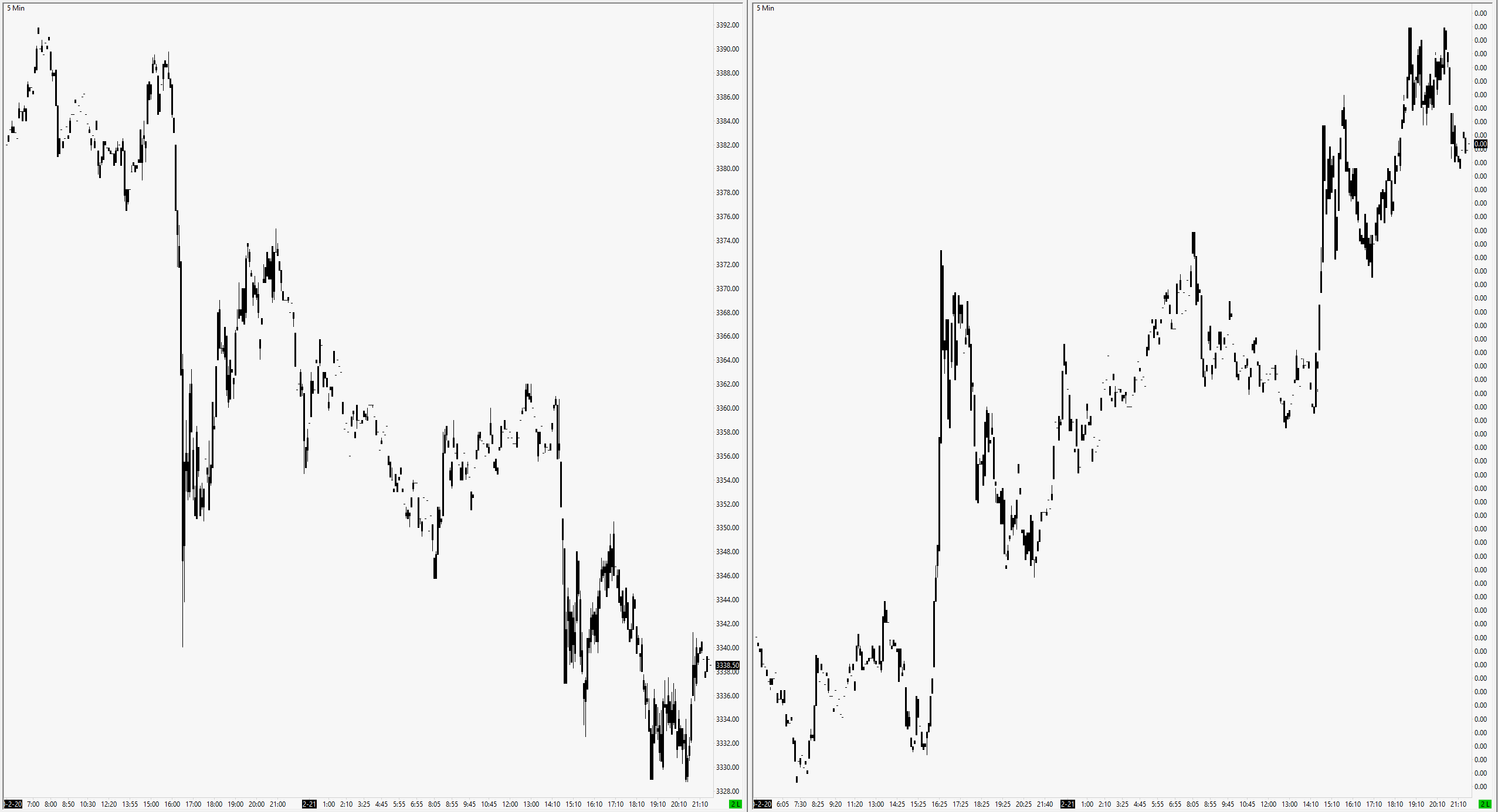 Sure, attached, same issue, 5 min ESM20 charts side by side. One thing to study may be the difference between 1 minute charts side-by-side seeems "better" than 3min.... then as you get up to 50min-ish charts, the problem starts to normalise. Weird, huh? You're welcome to remote view my computer as I display |