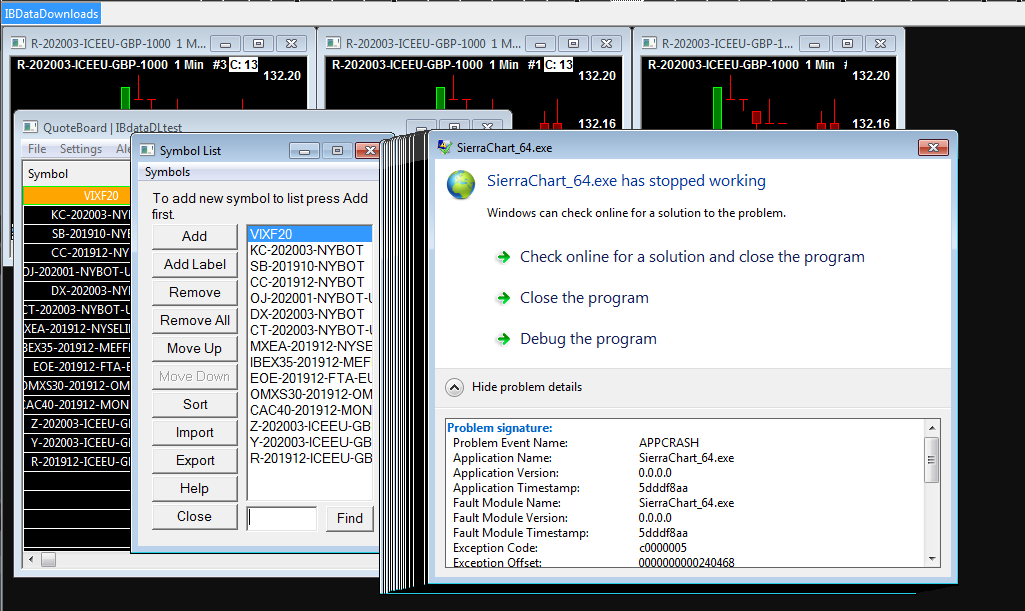 Hi SCE, just a notice: I was attempting to set a few Chart windows in v2017 to symbols that were loaded first to a new Quote Board window, then I clicked the 'Symbols' option in its menu bar, which opened a new Watch List window (titled 'Symbol List'). Then I clicked its Symbols menu option and Set Charts to Symbols...SC crashed. I'm running 64-bit Win7; screenshot of SC when it happened, and the error details from Windows are attached. |