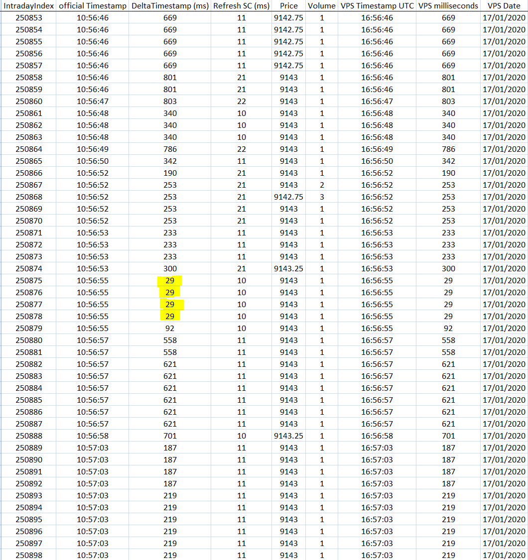 Second example : data from NQ100 future sent to a VPS in Chicago. Image 3 shows that the ticks at 10:56:55 arrive with a delay under 29ms. The other thing that this study showed is that this VPS gets a maximum of 13 packets of ticks per second, whatever the volatility, and that the delay was only rarely over 500ms (this can be guesstimated from the timestamps of the last ticks of the second). Those feeds are from Barchart/Sierra. Let me know how good your data feed is. And don't hesitate to bother me if you need help with the study. Date Time Of Last Edit: 2020-01-17 17:25:23