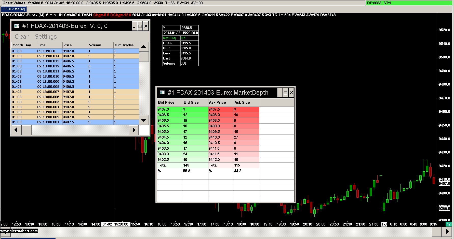Here is a screenshot of a chart and other windows with the new EUREX feed: http://www.sierrachart.com/image.php?l=138873708354.png Sierra Chart Support - Engineering Level Your definitive source for support. Other responses are from users. Try to keep your questions brief and to the point. Be aware of support policy: https://www.sierrachart.com/index.php?l=PostingInformation.php#GeneralInformation For the most reliable, advanced, and zero cost futures order routing, *change* to the Teton service: Sierra Chart Teton Futures Order Routing Date Time Of Last Edit: 2014-01-03 08:18:36