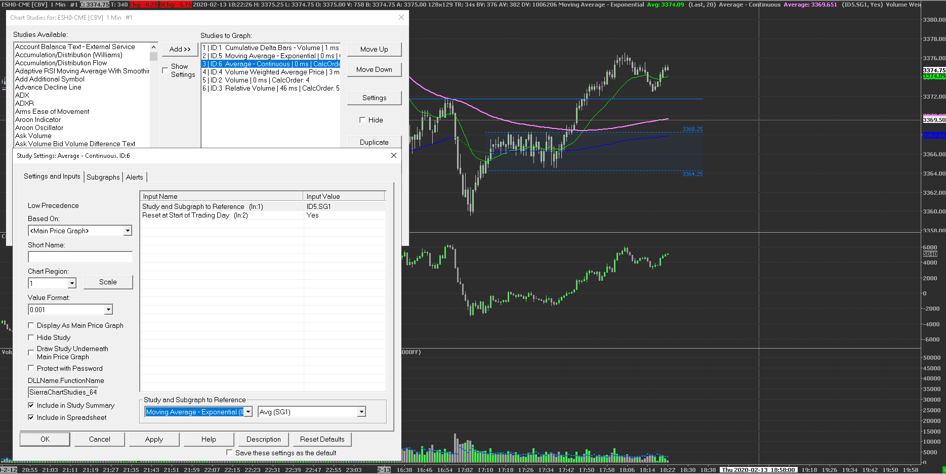 Good day. I have a problem with moving average. It Calculates not from the beginning of the session I trying to use a study (Average Continuous) to solve this problem but it don`t works. Pink (Average Continuous study) Green (EMA) |